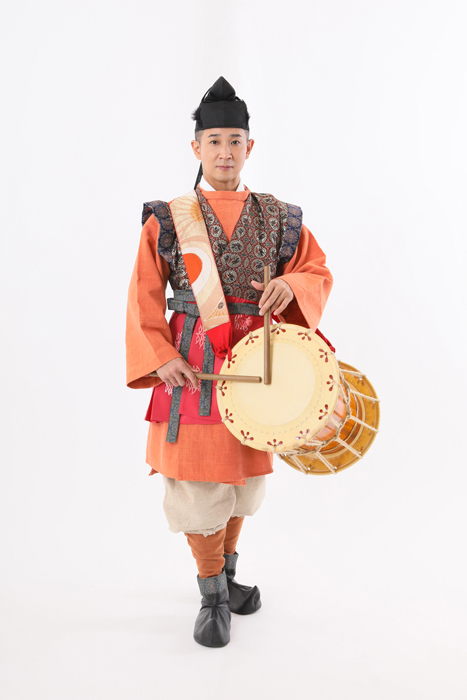 この日の撮影は演出・音楽監督を務める吉井盛悟からスタート。「楽神」をイメージした奈良時代の装束は麻でできており、意外に軽くて動きやすいという。腰を覆っている布部分の赤に白の模様を出しているのは当時の代表的な染めの手法。上半身の細かな織模様に対し衣と袴の素朴で明るい風合いのバランスも美しく、肩から下げた太鼓とも調和している。烏帽子と沓の黒がキリリと全体の印象を締めていた。