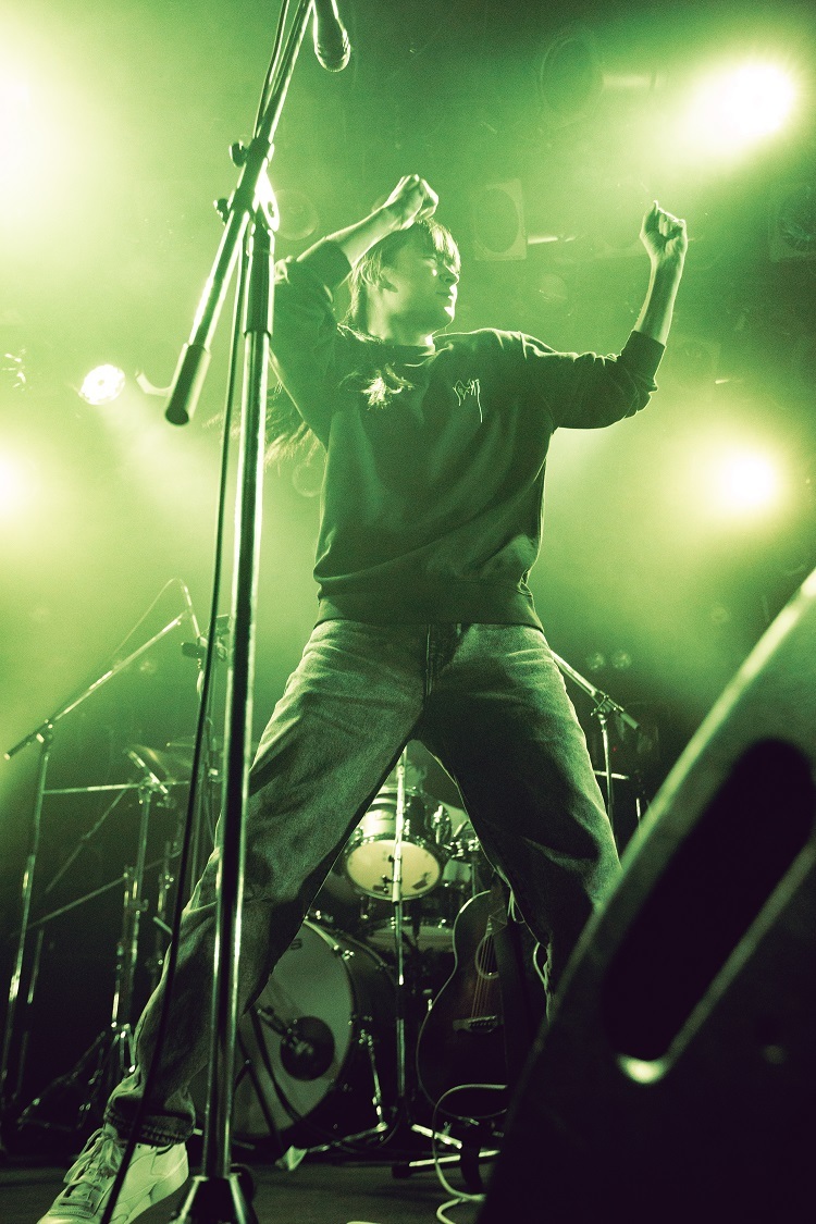 長いMCを経て演奏された「恵日」はアルバムで聴いて、絶対にライブ映えするだろうと楽しみにしてたロックナンバー。アコギを置いて再びマイクを握り、ヘヴィに鳴らされるロックサウンドに小林の男臭い歌声が映える。不安や痛みや苦しみを言葉の塊と吐き出すような、熱く悲痛な叫びがダイレクトに胸に響く。再びMCを挟んで「あと1時間、3曲で……?」と、誰もが「無茶だよ!」とツッコミたくなる呟きから即興トークが続き、続く「泪」に無理やり繋ぐ。寂しく諦観的な歌詞とは裏腹にシンプルなサウンドに乗せた小林のフロウが心地良い「泪」に続き、メンバー紹介を挟んで「共犯」が始まるとライブは早くも終盤戦。観客一人ひとりと共犯を画策するように近しいところから響く歌声で、観客との距離をグッと縮めたこの曲を歌い終えると、「30分巻きだけど、俺頑張ったよ!!」とここまでたどり着いた自身を褒め称え、ラストとなる「生活」を披露する。