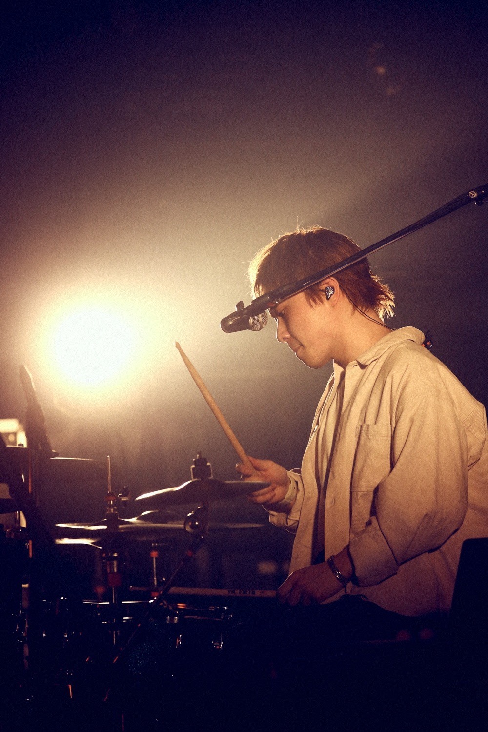 佐竹がアコースティックギターに持ち替え、オーディエンスを座らせる。「tiramisu」はほっこりとあたたかく、「GIRLFRIEND」は青くみずみずしく、そして「ワンルーム」はどこまでもせつなくエモーショナルに。バラードだというのに、いやバラードだからこそ感情を込めて饒舌に叩く酒田のドラミングが、「ワンルーム」のせつなさをより一層際立たせる。佐竹の声には素朴さと、ナミダ成分とでも言いたいウェットな要素が含まれていて、もの悲しさや憂いをたたえたバラードがよく似合う。バックライト一つでドラマチックに演出する、照明もハマっている。全員が楽曲の世界観を共有して最善のプレーをする、アイビーカラーのチームワークは抜群だ。