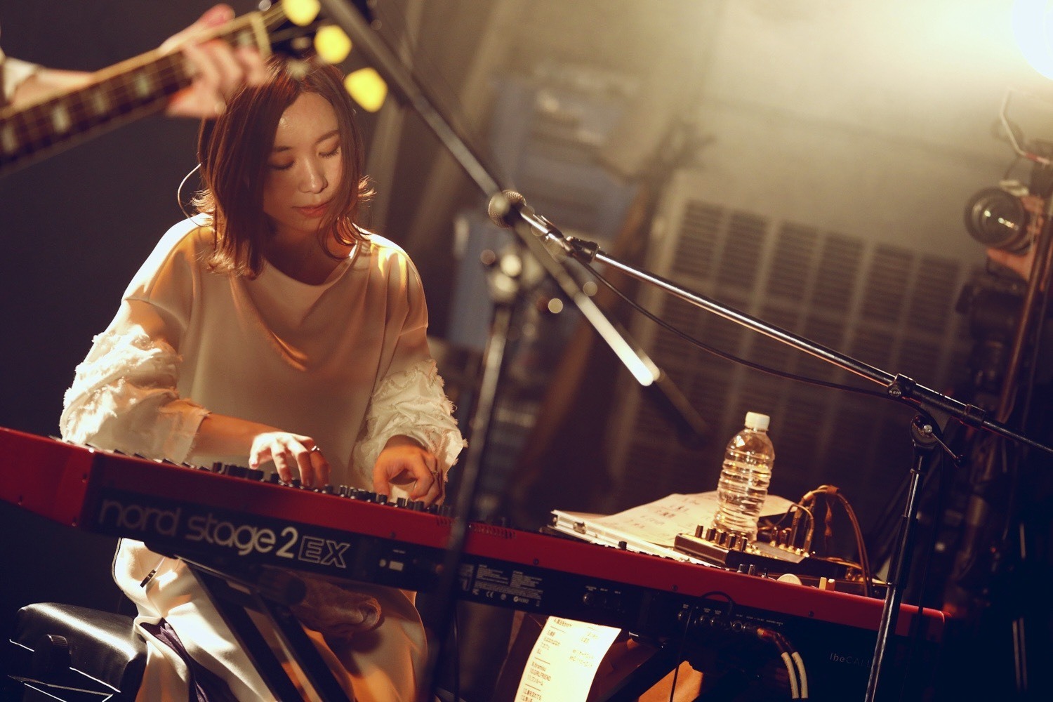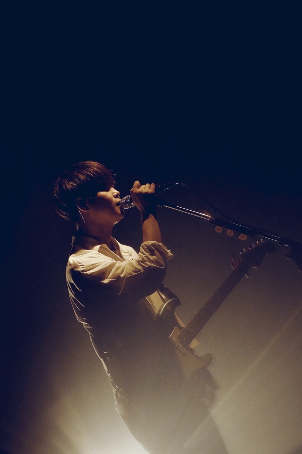 スポットライトを浴びた佐竹惇が、歯切れのいいリズムでエレクトリックギターをかき鳴らす、1曲目は『WHITE』のオープニングを飾った「東京、消えた月」だ。これまで以上にパワフルに、ダイナミックに、骨太に奏でるバンドサウンドがいきなりかっこいい。酒田吉博(Dr)の蹴りだすキックの重低音が、下腹にずっしり響く。碩奈緒(B)と川口彩恵(Key)はにこやかな笑顔を見せつつ、出している音はえげつないほどに太く強い。行儀よく座っているオーディエンスを見て、「立っていただいてもいいですか!」と佐竹が煽る。5分前まで静かな緊張感に満たされていたフロアに音が響き、光が溢れ、熱い風が吹き抜ける。しばらく忘れていたこの感覚、そうだ、これがライブだ。