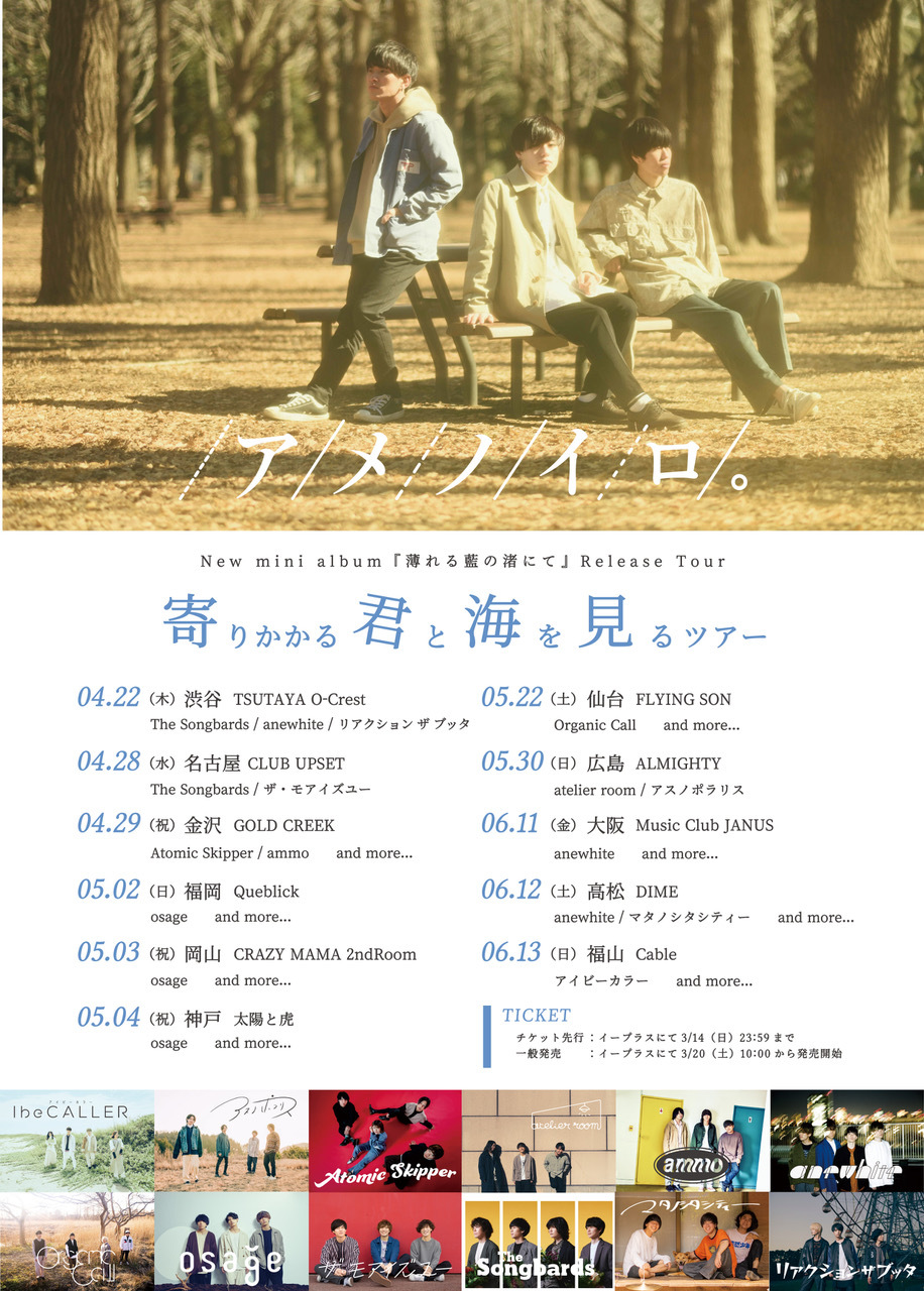 3月31日にミニ・アルバム『薄れる藍の渚にて』をリリースするアメノイロ。が、4月より開催するツアーのゲスト第1弾を発表した。