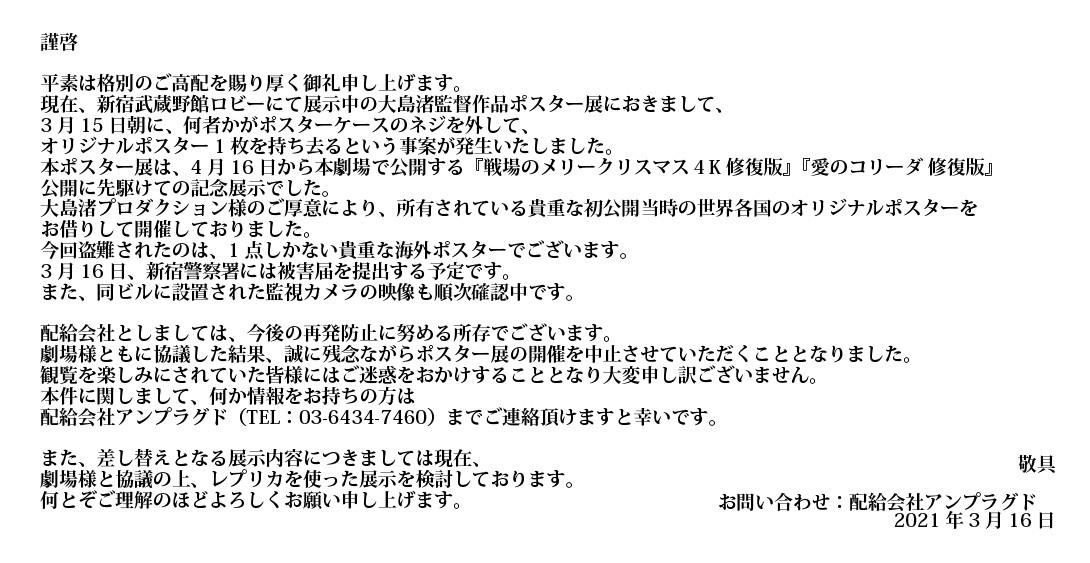 ポスターの展示は、2作品の公開に先駆け大島渚プロダクションの厚意により実施。しかし、同作を配給するアンプラグドによれば、3月15日朝に何者かがポスターケースのネジを外し、オリジナルポスター1枚を持ち去られる事案が発生。『戦場のメリークリスマス』の場面が切り取られた、1点しかない貴重な海外ポスターが盗難被害に遭ったため、3月16日には新宿警察署に被害届を提出するとのこと。また、今後の再発防止に努めるとともに、劇場と協議した結果、ポスター展の開催中止を決断したという。