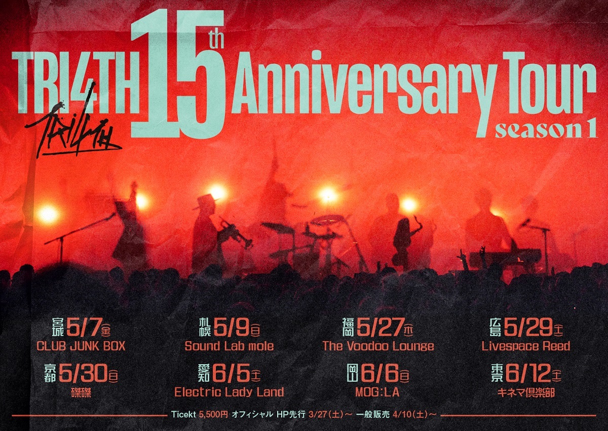 “踊れるジャズバンド”ことTRI4THが、バンド結成15周年を記念したアニバーサリーツアー『TRI4TH 15th Anniversary Tour season1.』の開催を発表した。