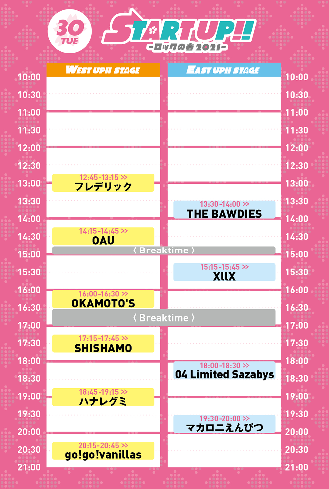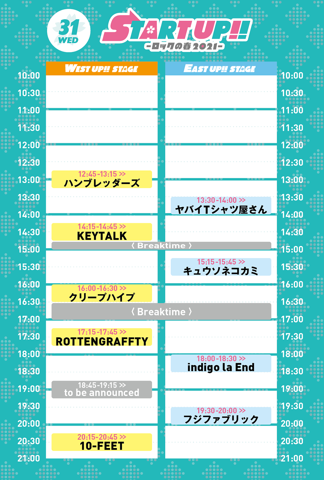 3月30日(火)、31日(水)、インテックス大阪にて開催される『START UP‼️-ロックの春2021!-』のタイムテーブルが発表された。
