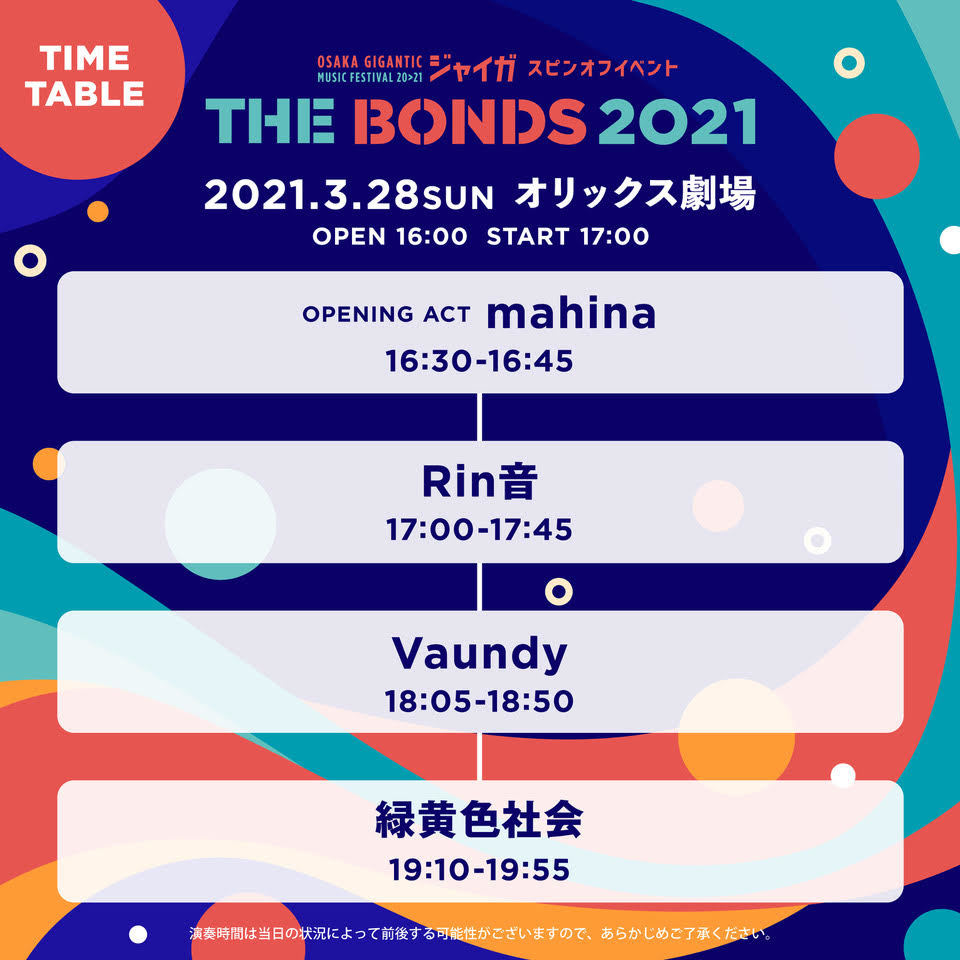2021年3⽉28⽇(⽇)オリックス劇場にて開催される『THE BONDS 2021』のタイムテーブルが発表された。