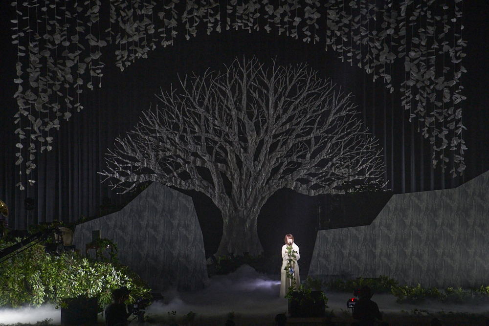 次の瞬間、ステージが暗転。ほどなくして、薄明かりの中で白いロングコートを羽織った上田の姿が浮かび上がる。その背後の大樹はすっかり葉を落とし、灰色に。“湖”だったステージは、“冬”を迎えていた。そんなモノクロの世界で披露されたのは、上田の声とピアノの音だけで奏でられる「旋律の糸」。両手で自らの首を絞めるような仕種で「殺してく並んだ糸を一つ 切り離そう 私と世界を」と歌い、うっすら笑みを浮かべる上田の姿には静かな狂気を感じた。