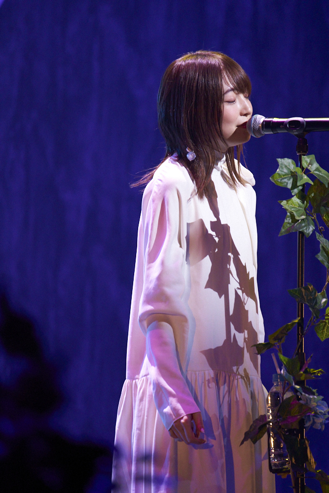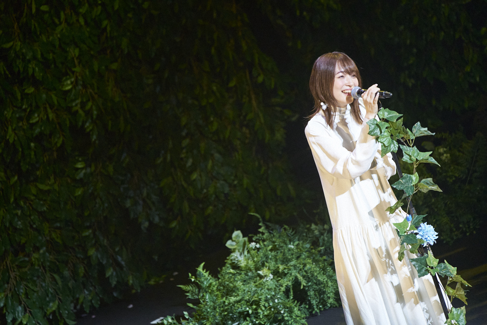 「海の駅」をワンコーラス歌ったところで紗幕が上がると、ステージ最奥に青々と葉を茂らせた大樹、その手前に緑に包まれた丘を設けたステージセットが露わになり、先ほどまで“海”だった空間が“森”へと変わる。上田はシンプルな白のロングワンピースに、羽をあしらった白いスニーカー、右耳にイヤリングという出立ちで、柔らかい笑みを浮かべながら「海の駅」を歌い終えると「みなさんこんにちは、上田麗奈です」と客席に向かって一礼。