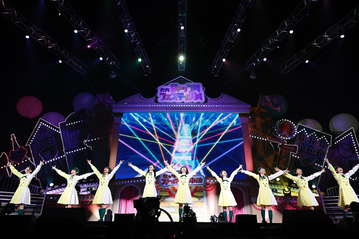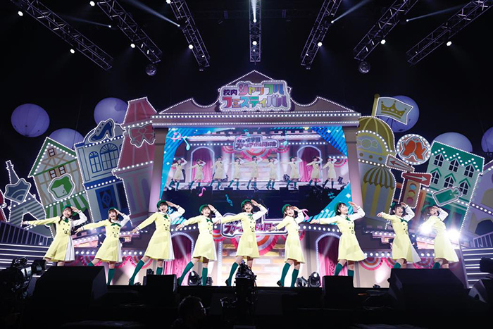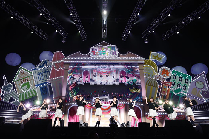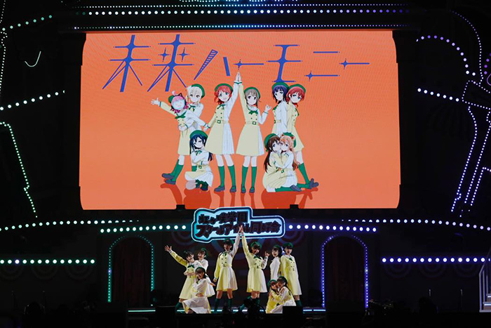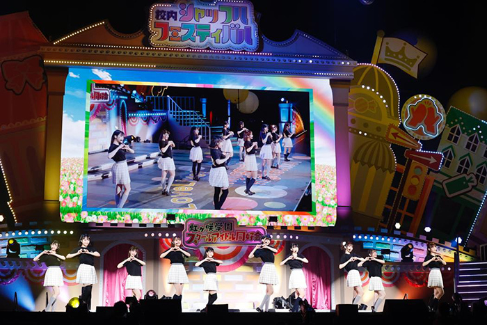 そしてシャッフルの前のアニメナンバーコーナーとして「未来ハーモニー」「NEO SKY, NEO MAP!」の二曲を連続で披露。「未来ハーモニー」ではアニメPVに合わせたシンクロパフォーマンスを、そして「NEO SKY, NEO MAP!」ではテレビアニメのエンディングムービーに合わせて全員がイメージカラーの傘を携え、それを手にしながらのカラフルなダンスを繰り広げてる。そして最後は雨上がりをイメージするかのような明るいライティングに照らされながら、後に控えるシャッフルステージのために引き上げていった。