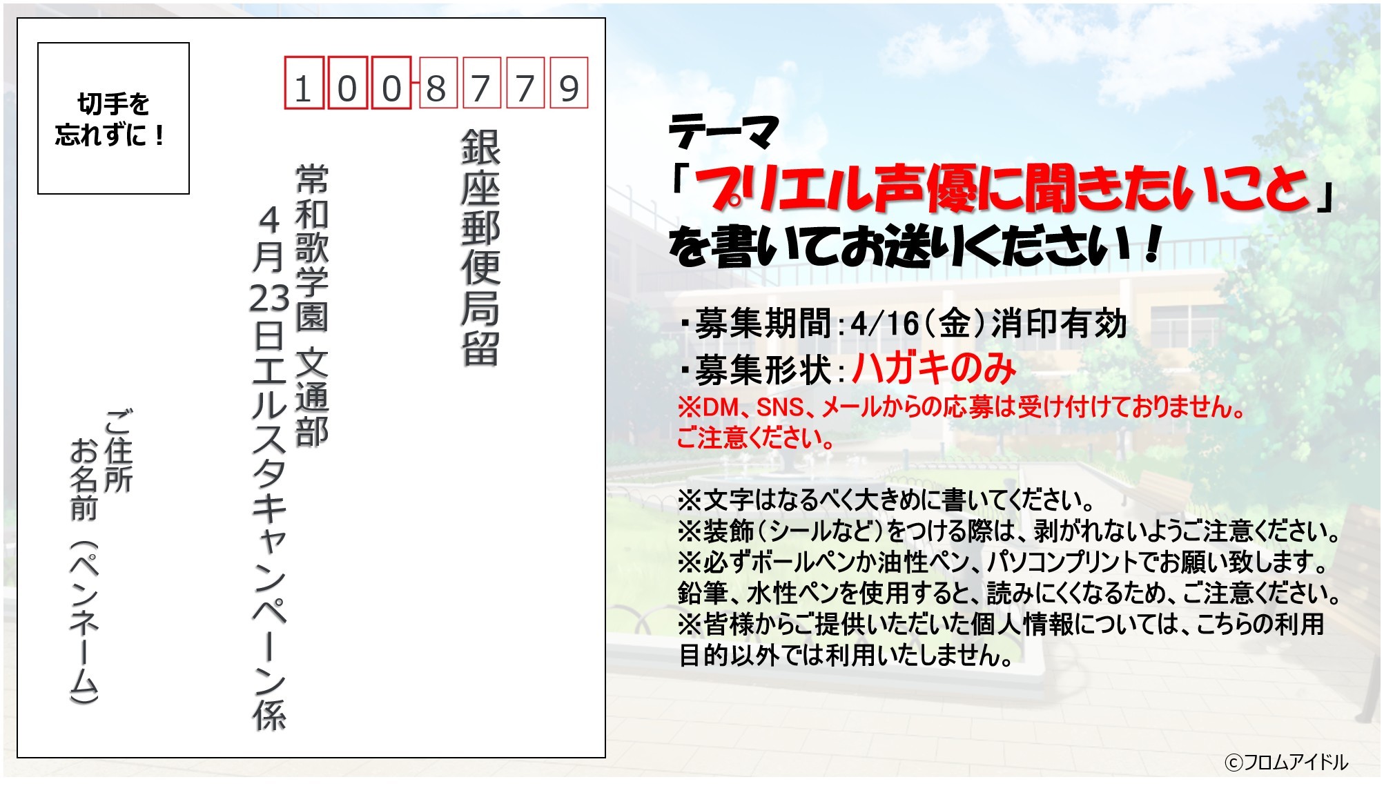 無料生配信イベントでは、質問を「ハガキ」限定で受け付ける。 募集期間は本日3月23日(火)~4月16日(金)(4月16日当日消印有効)。 当日は声優たちがピックアップし、回答する。あなたのハガキが読まれるかもしれない。