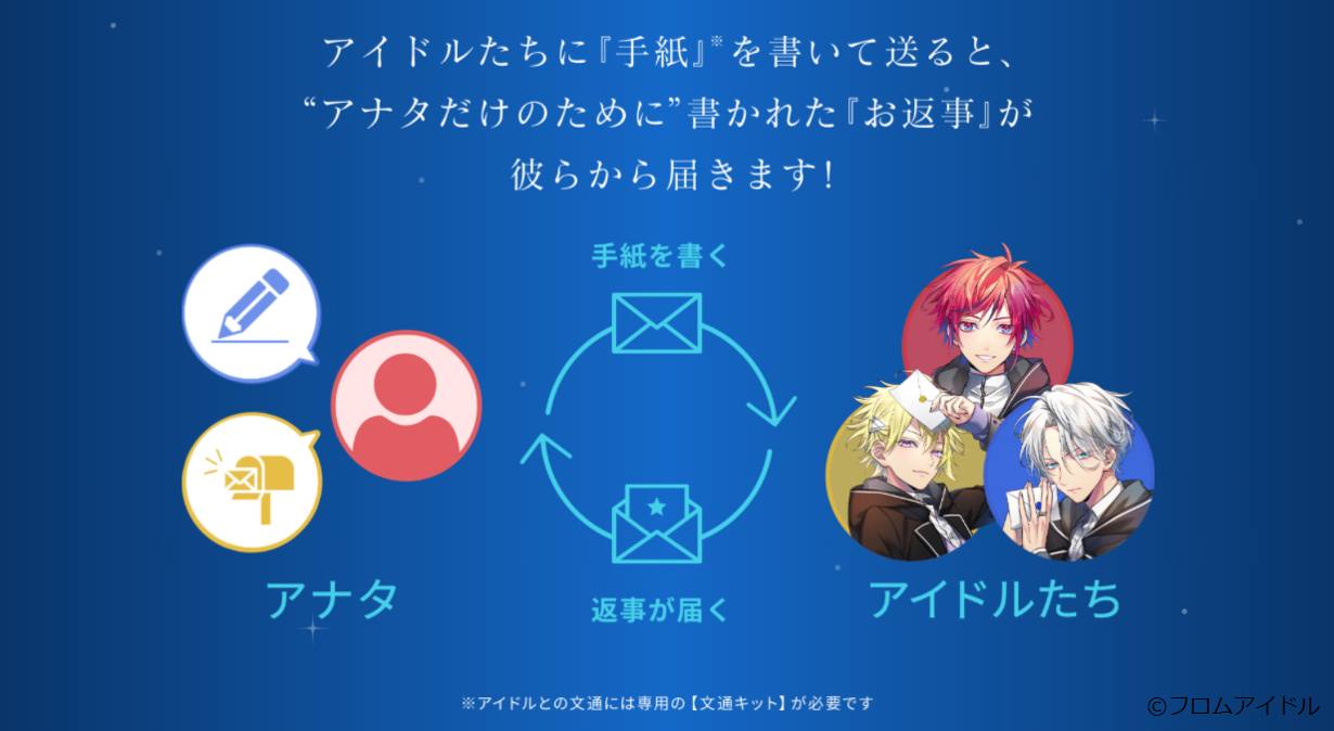 アイドルたちとの文通のやり取りには専用の「文通キット」(有料)の購入が必要となります。