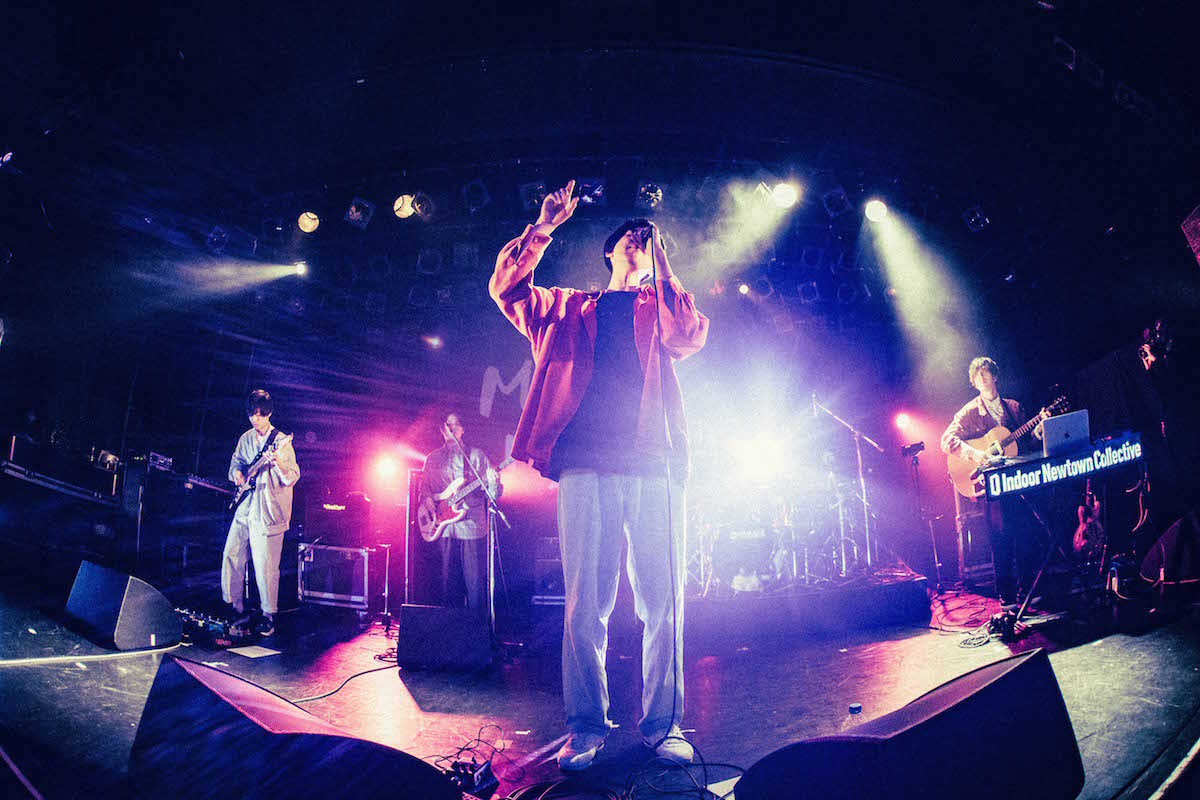 SEが鳴り、5人がステージに揃うとブルーのライトの中キーボード前面に「Indoor Newtown Collective」の文字が浮かび上がった。1曲目に披露されたのは、淡々と暗がりに光を与えるように歌う「NIGHTS」。後半にかけて深く潜り込むような歌唱から流れるように突入した「2019」では、「ゆるく体を揺らしながら最後まで楽しんでください」と四方颯人(Vo)自ら自由に歌い踊る姿で会場の空気を解きほぐしていく。そんな『インドア』に収録された2曲を披露した後、間髪入れず「街の中で」、「WAV」、「Surfing」と『アウトドア』の楽曲を披露。時に熱っぽく、時に艶っぽい四方の歌がフロアを先導し、自ずと巻き起こるクラップが会場に心地いい波を作っていた。