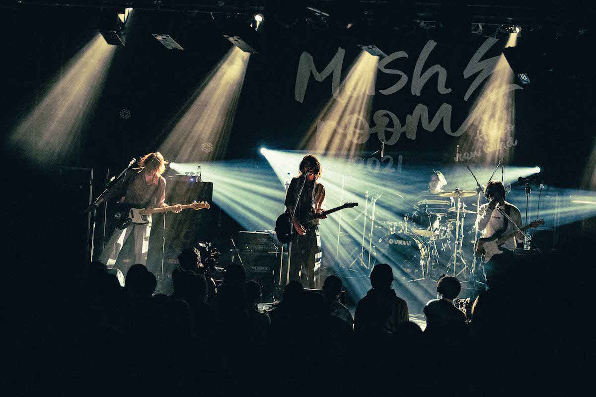 オープニングアクトとして登場したのは、MASH A&Rが主催するオーディション『MASH HUNT』の第1回目となる『MASH HUNT LIVE Vol.1』にてBEST ARTISTを獲得したEzoshika Gourmet Club。手を挙げ、「MASHROOM 2021よろしくお願いします!」という池澤英(Vo/Gt/Key)の挨拶から、1曲目に披露されたのは「東京」。疾走感のある爽やかなサウンドが会場に充満する中、一気に駆るシンセの音や、額田一佑(Gt)のアグレッシヴなギターパフォーマンスなど、心を高揚させる仕掛けが随所に盛り込まれる。続く「弾ける炭酸」から「猫と占いと家具屋」まで、遊び心を交えながら自分達のペースで伸び伸びと歌い鳴らす姿は、オ-プニングアクトのプレッシャーも跳ね飛ばす堂々たるものだった。