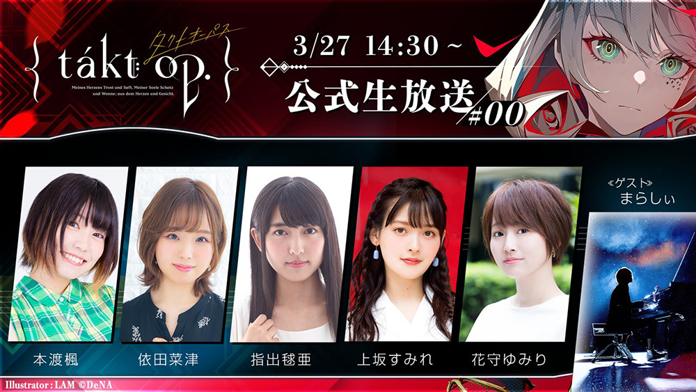 3月27日(土)14:30より、「『takt op. (タクトオーパス)』公式生放送 #00」が配信される。豪華声優陣を迎えて、プロジェクトの全貌・魅力に迫る。更に、ピアニスト/作曲家のまらしぃもゲスト出演予定。