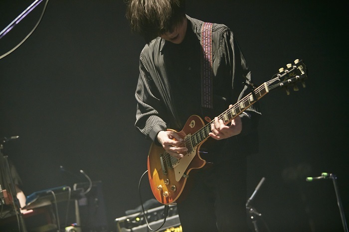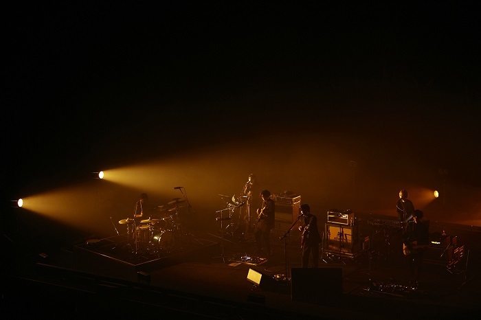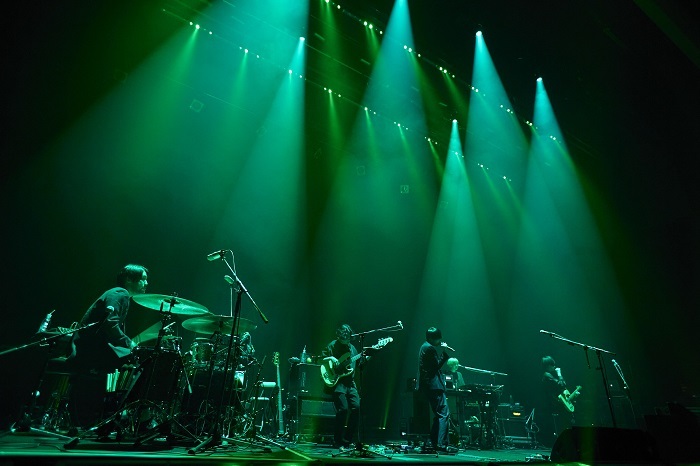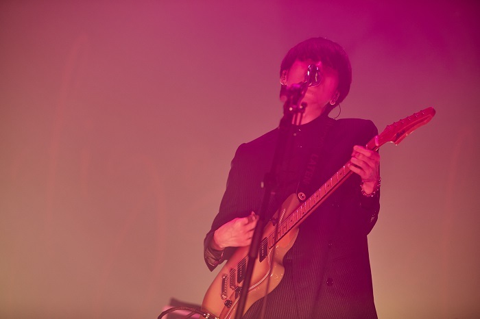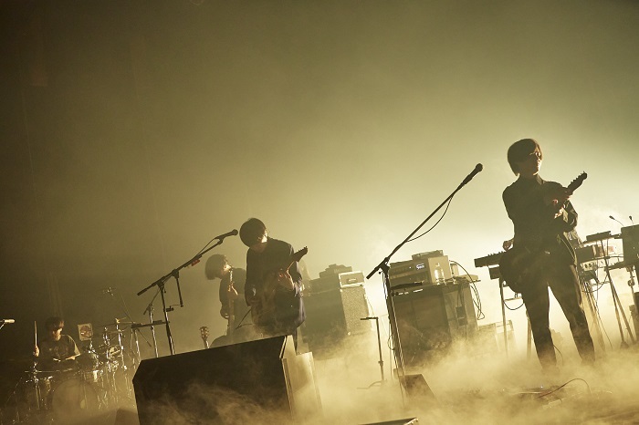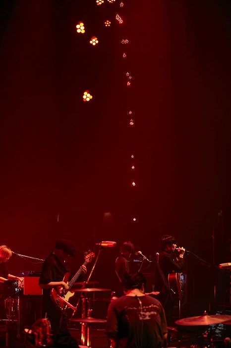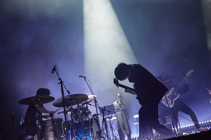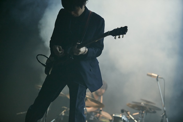 序盤から基本的にシリアスなトーンが続いていたが、ここで肩の力を抜くかのように、メンバー全員でユルめのMCを展開。こうしたオンオフの切り替えもまた、バンドの大きな魅力だったりする。そこからもう一度ギアを入れ替えて、シアトリカルな赤い照明の中で川谷がギターをかき鳴らすイントロから、『夜行秘密』の中でも最もヘヴィでオルタナティヴな“晩生”を披露。間奏では佐藤が立ち上がってスネアを叩き、アウトロではストロボがたかれる中でギターもベースも思いっ切り歪ませて、シューゲイザーばりのサイケ空間が構築されると、ラストは2ビートで疾走し、混沌の中で本編が締め括られた。