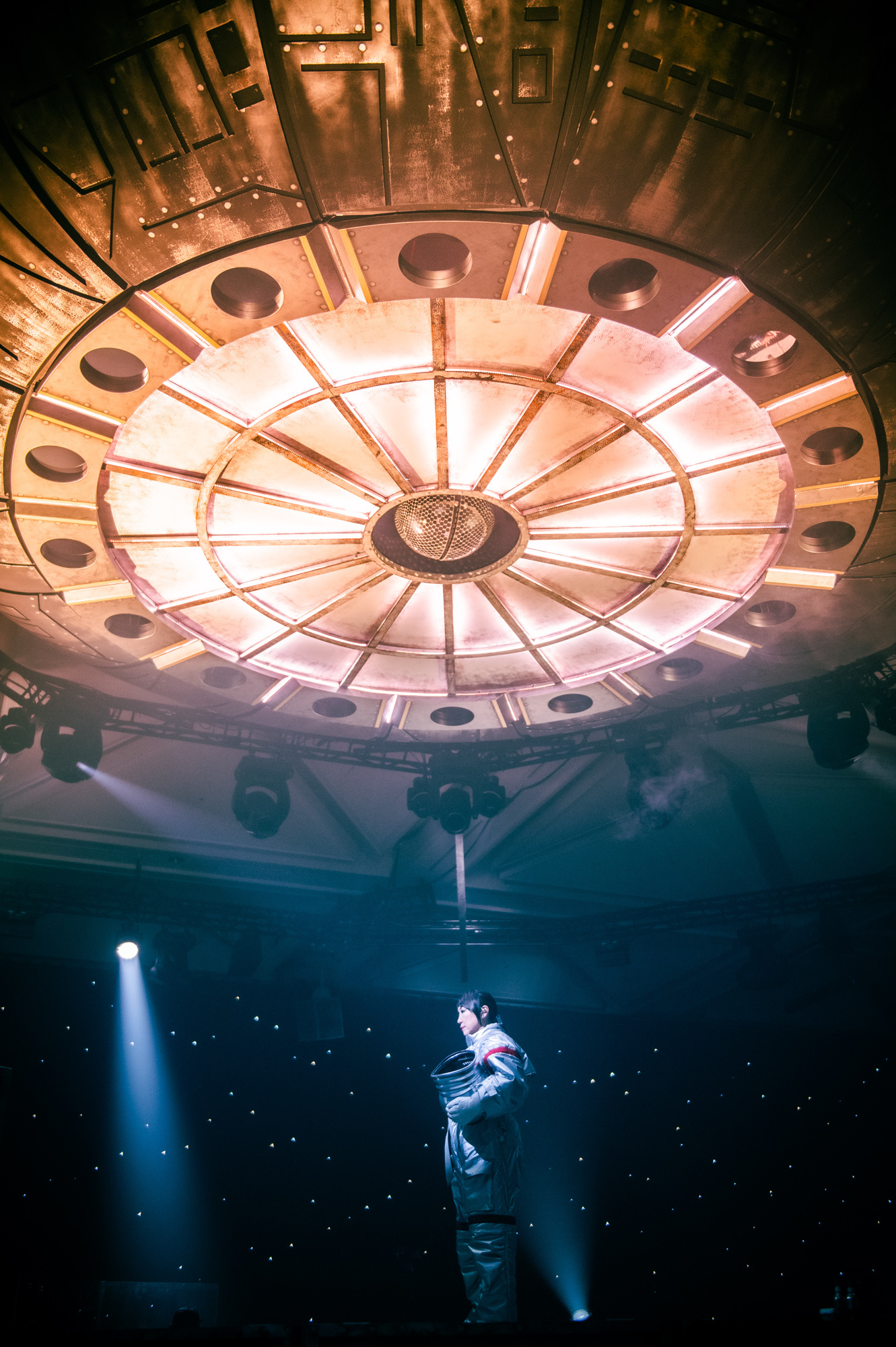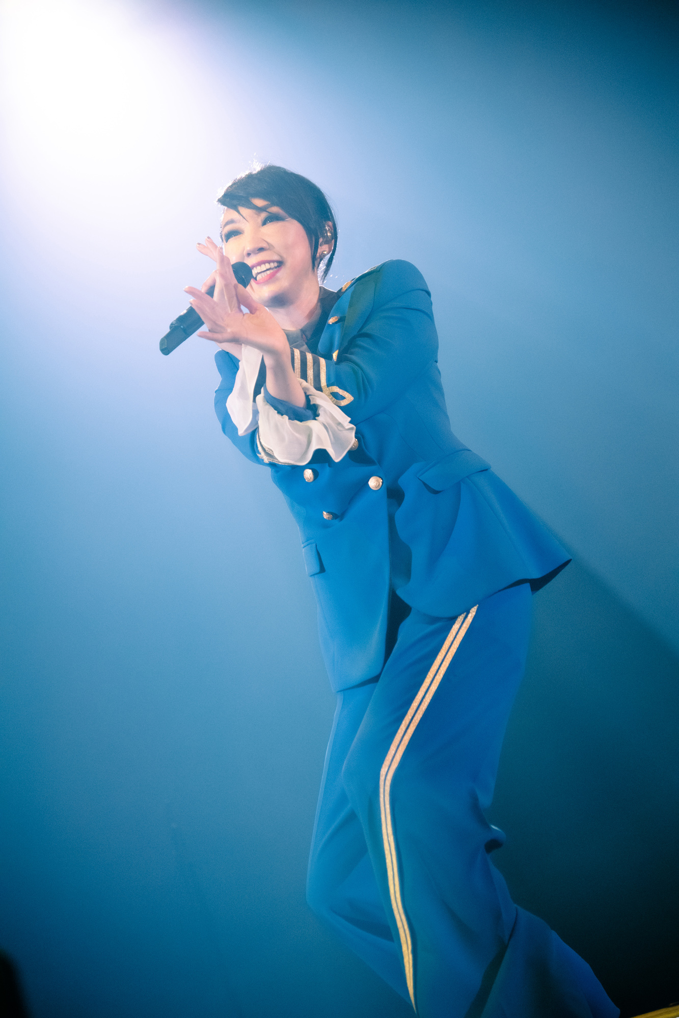 オープニングは、1990年リリースの日本初のダブルミリオンを記録したアルバム『天国のドア』の収録曲「SAVE OUR SHIP」よりスタート。この楽曲は同年、日本人初の宇宙飛行士・秋山豊寛氏のドキュメンタリー特番『TBS宇宙プロジェクト「日本人初!宇宙へ」』のテーマ曲に起用された楽曲。幻想的な照明演出の中、オープニング曲を歌い終えると、その宇宙服から一転、パーサーの様なブルーのスーツスタイルに早変わり。「こんな状況の中、みんな来てくれてありがとう。この1年長い長い道のりでした。こんな時だからこそ、いつものようでいつもとは違うステージをお見せしたいと思います」という挨拶に続いて、昨年12月にリリースされた最新アルバム『深海の街』より、タイトル曲「深海の街」を披露。