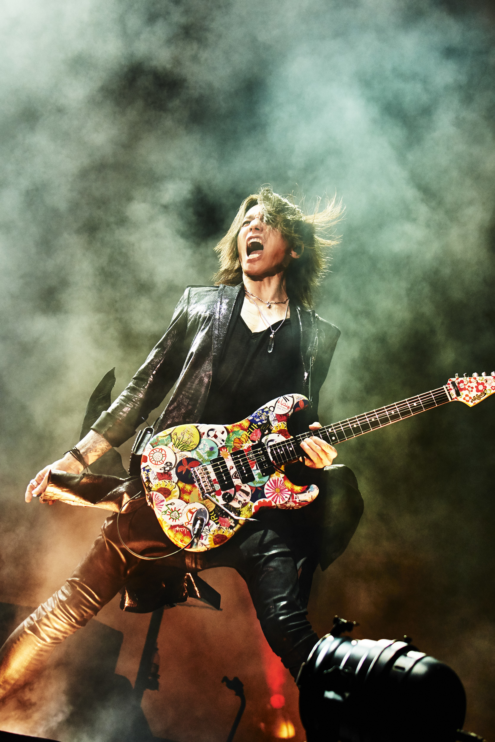 そのあと、「STORM」ではギターソロを弾くSUGIZOをRYUICHIとINORANが手をひらひらさせて盛り上げたり、「TRUE BLUE」では真矢を盛り上げようとその2人がドラムセット前の階段にポジションを移動するなど、迫力ある演奏とともに、いつも以上に楽しそうにはしゃぐメンバーたち。「ROSIER」では、SUGIZOのギターソロとバトルするようにノンブレスで歌を展開するRYUICHIの鬼気迫るパフォーマンスが場内の熱気をかき立てたところに、ダメ押しで「TONIGHT」を投下。会場がさらなるクライマックスへとのぼりつめていったなか、第2部は終わりを告げた。