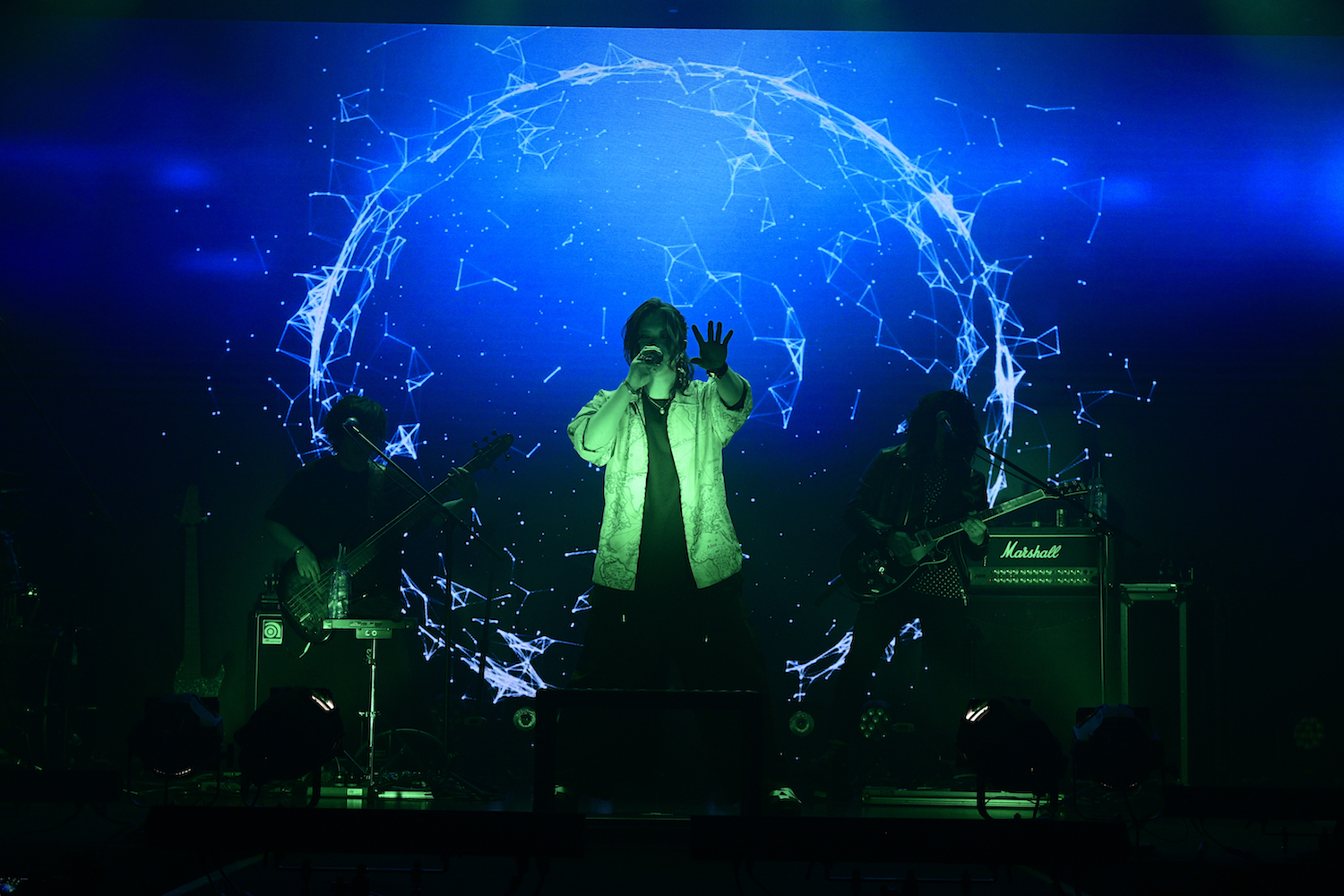 そう挨拶して、2020年12月に動画投稿した「旧約汎化街」へ。クセになるリズムが効いた重厚なサウンド、あらきがなぞる不穏なメロディが重なって、グリーンが印象的なライティングがサイケデリックに彩る。まったくブレないロングトーンにも、驚かされてしまうではないか。