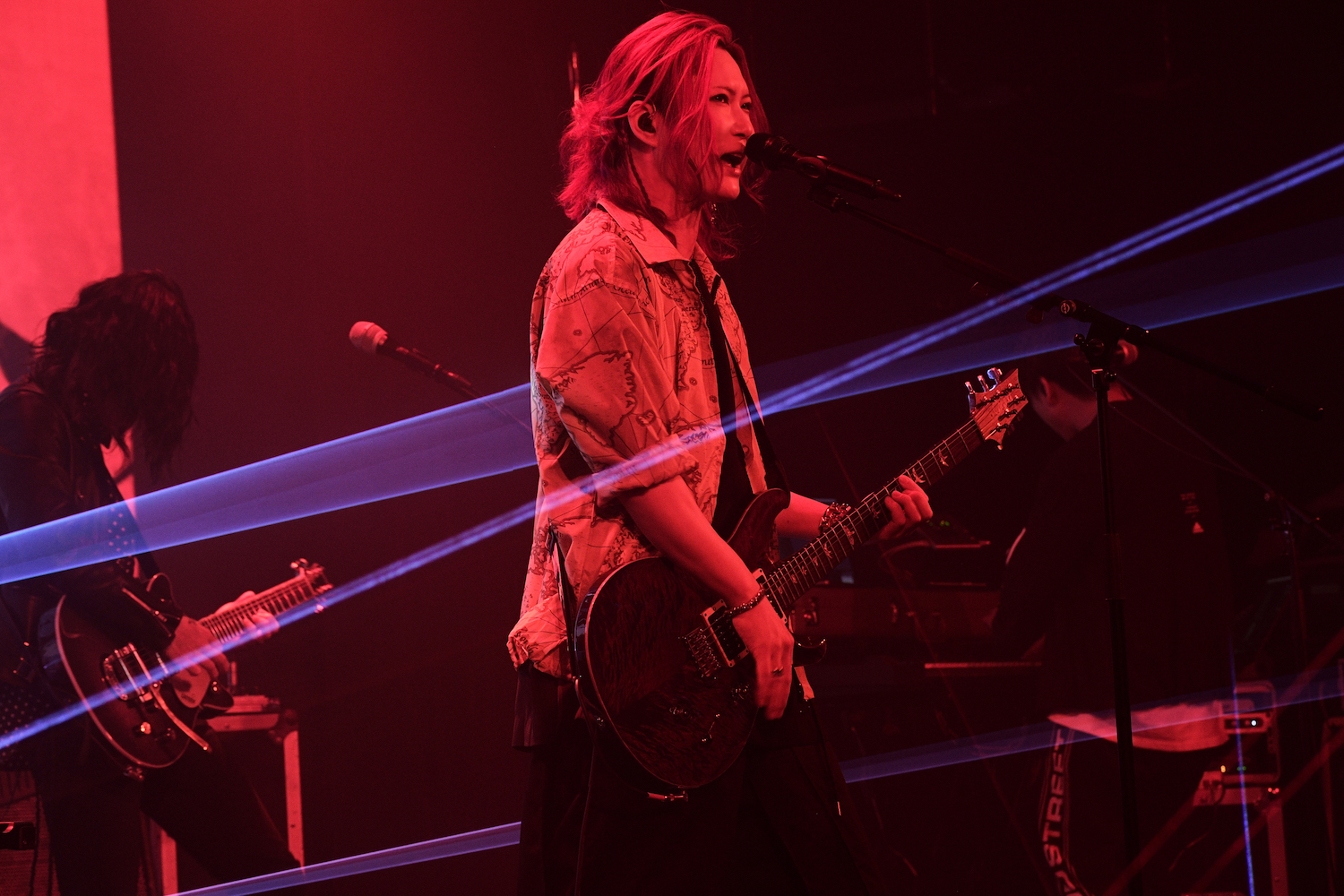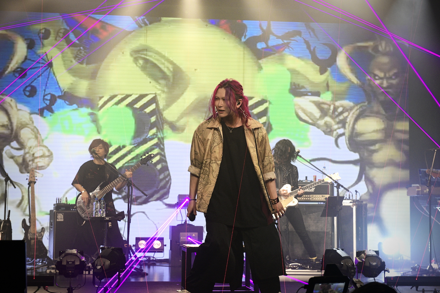 力強く決意表明&メッセージしたうえで、怒濤の終盤戦の始まりは「スーサイドパレヱド」。疾走するカオスな音像とあらきの圧倒的な歌声の相乗効果は、息を呑むほどだ。イントロでお立ち台に乗った「URUSaaA愛」では、圧巻のハイトーンを響かせたり、加速する爆音に身を任せ頭を振ったり。