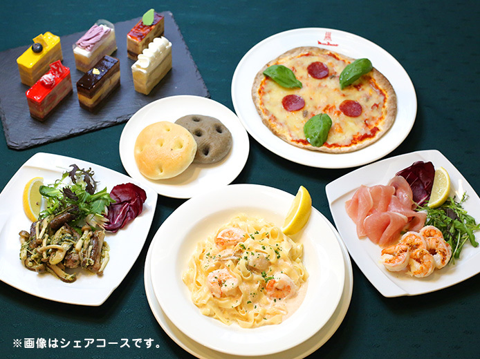 メニューは、オードブル(2種盛)、パスタ、パン、メインディッシュ、デザートの全部で5品。ひとりで楽しむ「シングルコース」と、ピッツアとケーキが4個から6個に増えた「シェアコース(約2名様でシェア)」が用意されている。