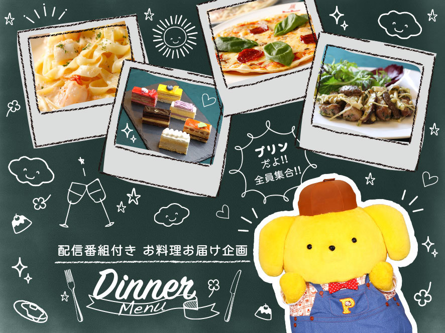 これは、ポムポムプリンが登場する配信を見ながら自宅に届く料理を楽しめる、オンラインのディナーショーのような配信番組付き お料理お届け企画。イベントは4月25日(日)20時より、みんな一緒に「いただきます」でスタートする。