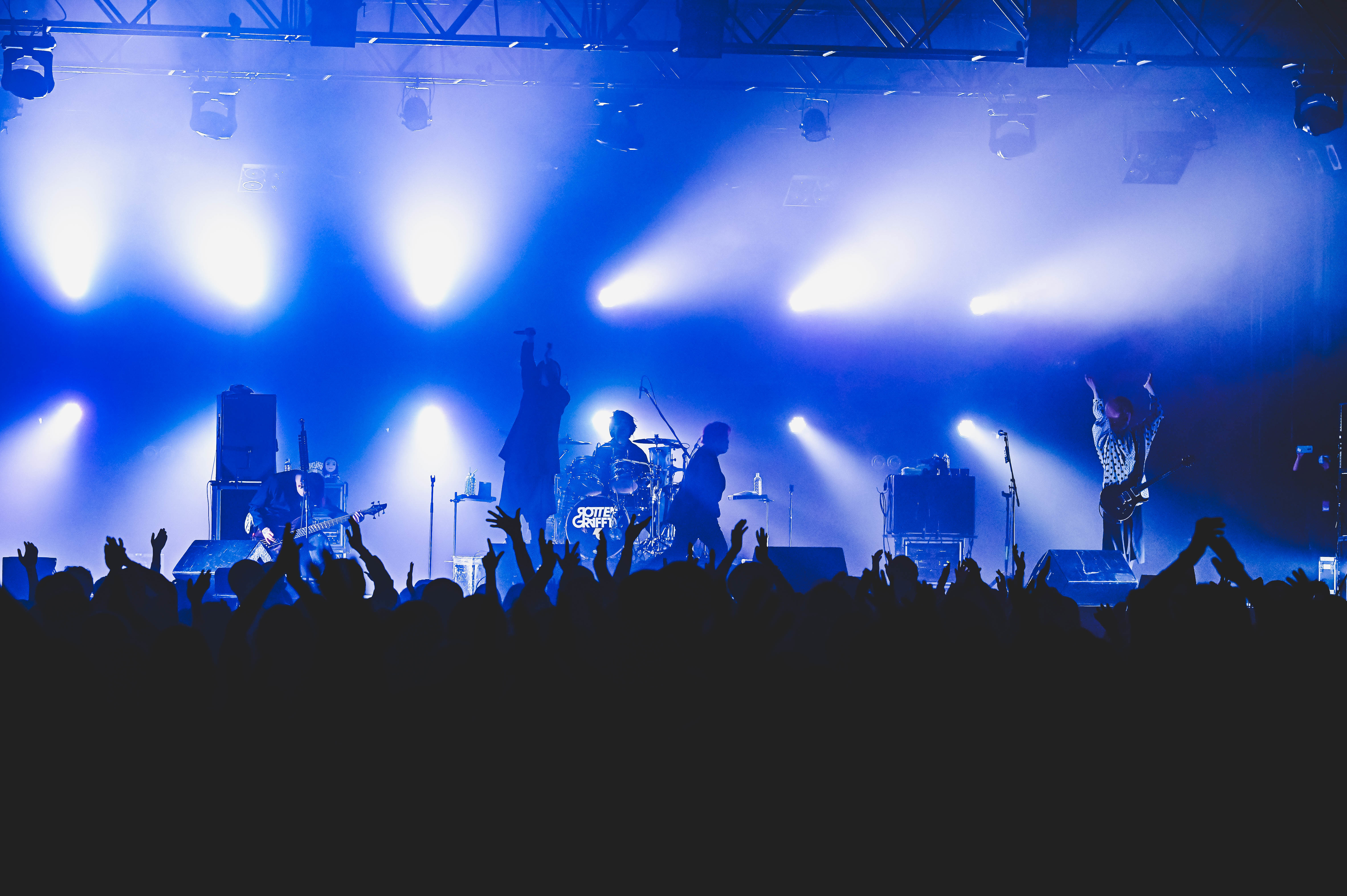 「去年はあんまりライブができなくて、制作ばかりしていたんですけど、唯一発表できた曲があります。見て聴いて感じてください」(KAZUOMI)と紹介されたのは、ライブ初披露の「永遠と影」。HIROSHI(Dr)と侑威地(Ba)の強靭なリズム隊が牽引する刺激的なハードコア・ミクスチャーサウンドはROTTENGRAFFTYの次章を示すかのよう。