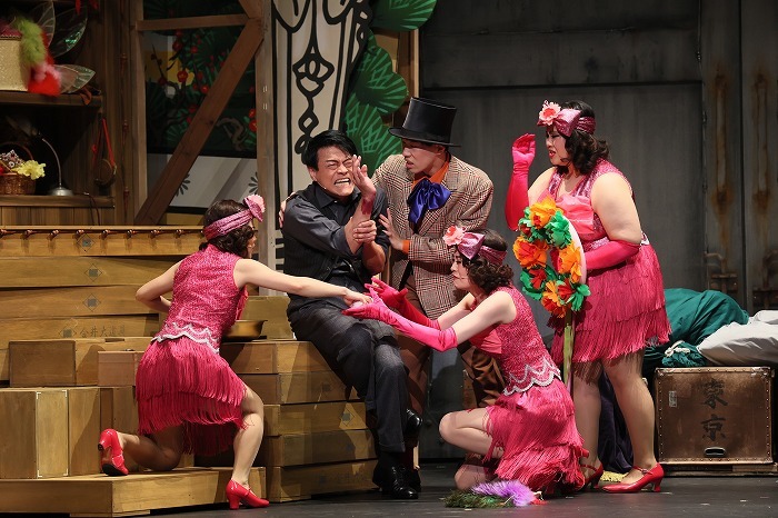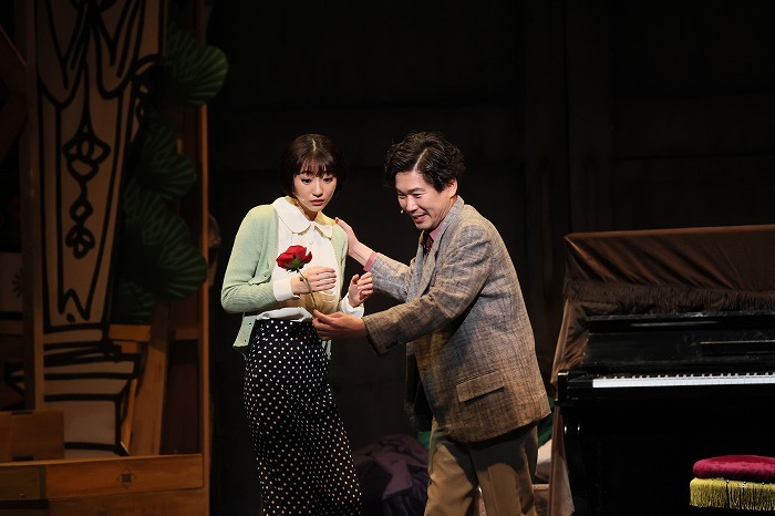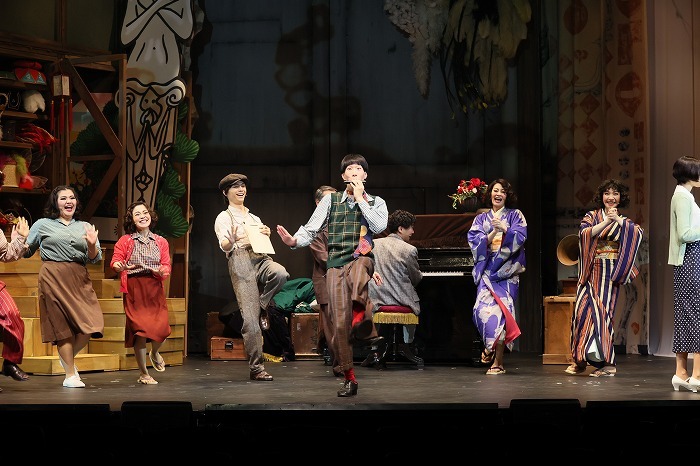 ゲネプロでは、ステージ上に浅草のレビュー小屋の舞台裏と思しきセットが組まれ、古ぼけたピアノやレビューで使う小道具、仮眠を癒やすためのベッドなどが雑然と置かれていた。そんな場所に警察から逃れて潜り込んだ加藤は、学生から、やがてひょんなことがきっかけでレビューに出る側となり、やがては浅草エフリィの芸名でレビューの人気者になっていく。不景気と戦争が切迫する時代であり、「不要不急」とこき下ろされるレビューの世界に生きることに悩み揺れながら、矢萩は劇場の扉を開き、歌い、踊り続けることの意味を仲間たちとともに噛みしめてゆく。その陰が濃いほど、レビューはさらに華やかさを増すと言わんばかり。加藤は複雑に心を揺らす矢萩を真摯に、そして丁寧に描いていた。