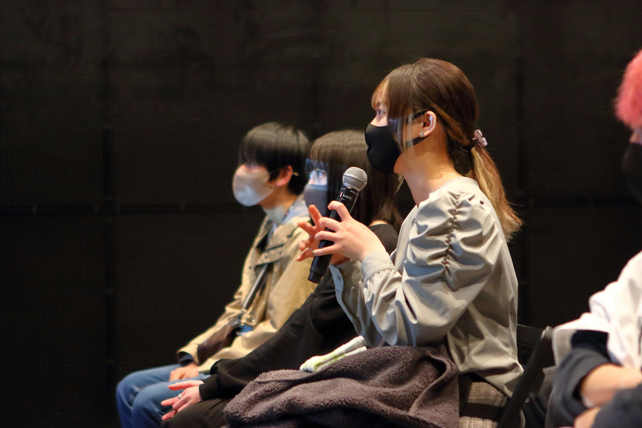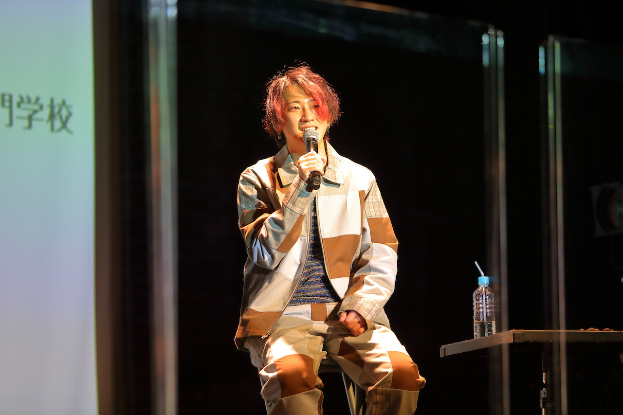 まずは彼のルーツを探るべく始まった幼少期の話では「いじわる好きでした(笑)」と笑いを交え、わんぱくだった少年時代を明かす。しかし、ある種いじわるに相手を突くクールな視点が必要なMCバトルに、その性格はいかされているようで「こないだも自分のバトルを見て、あ、性格悪って(笑)」と、さらりと自虐も入れつつ鋭く自己分析も。さらに昔聴いていた音楽や地元・福岡でのMCバトルの経験、活動当初に行っていたフリートラックを使ったラップ制作の話など、年齢も近い学生たちにとって興味深いであろうその音楽背景を披露し、彼らの探求心を刺激する。