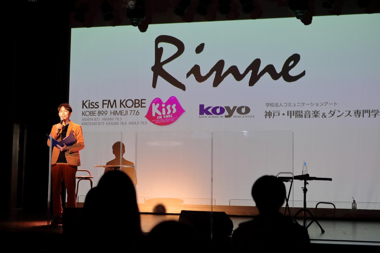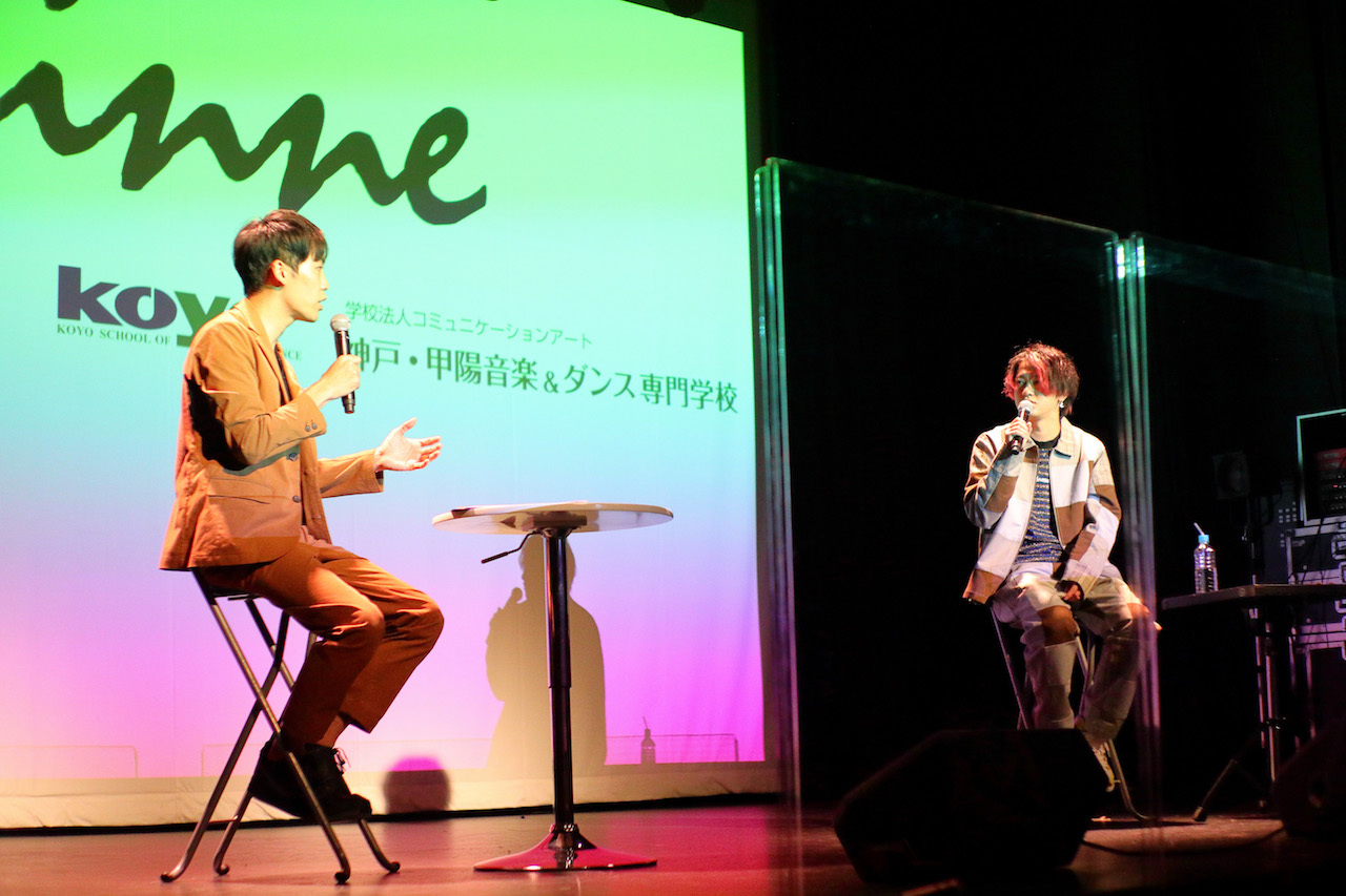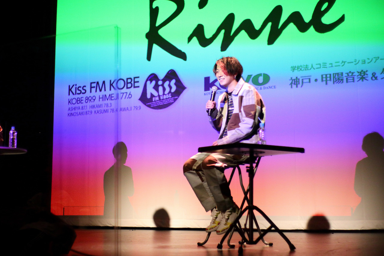 今回ゲストに迎えたのは、昨年リリースの曲「snow jam」がTikTokで話題となり、 SpotifyやYouTubeなどでも抜群の注目度を誇る、福岡県出身の新世代ラッパー・Rin音。彼は将来ミュージシャンや音楽業界での仕事を志す学生たちの前に「ちょっと寝違えちゃって(笑)」とリラックスした様子で現れると、客席からの質問にも答えながら進行役であるKiss FM KOBEのサウンドクルー・川田一輝とさまざまなトークを展開していく。