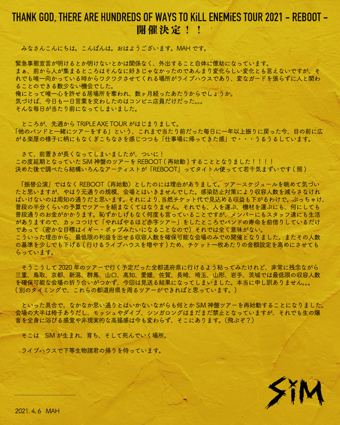 SiMが、昨年春にリリースした5thフルアルバム『THANK GOD, THERE ARE HUNDREDS OF WAYS TO KiLL ENEMiES』を携えた全国ツアー『THANK GOD, THERE ARE HUNDREDS OF WAYS TO KiLL ENEMiES TOUR 2021 – REBOOT –』を開催することを発表し、併せてMAH(Vo)からもコメントを公開した。