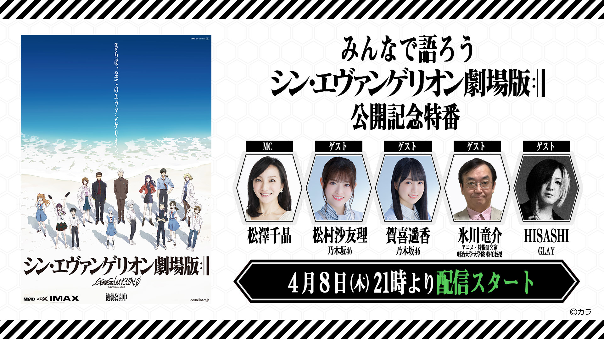 ゲストは、『エヴァンゲリオン』シリーズのファンである松村沙友理と賀喜遥香(ともに乃木坂46)、『エヴァンゲリオン』公式ライターでアニメ・特撮研究家の氷川竜介、さらにHISASHI(GLAY)。MCは、松澤千晶。