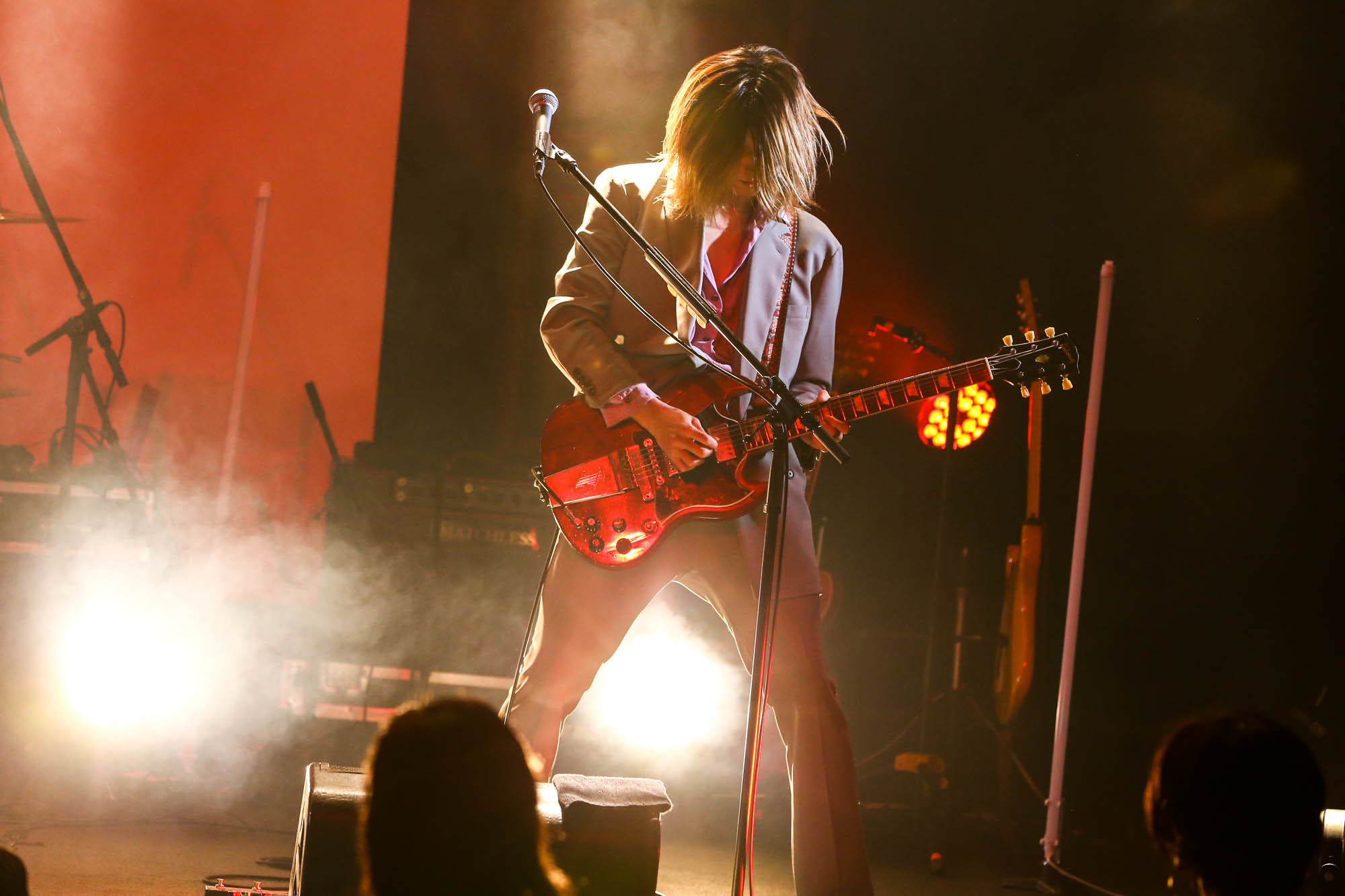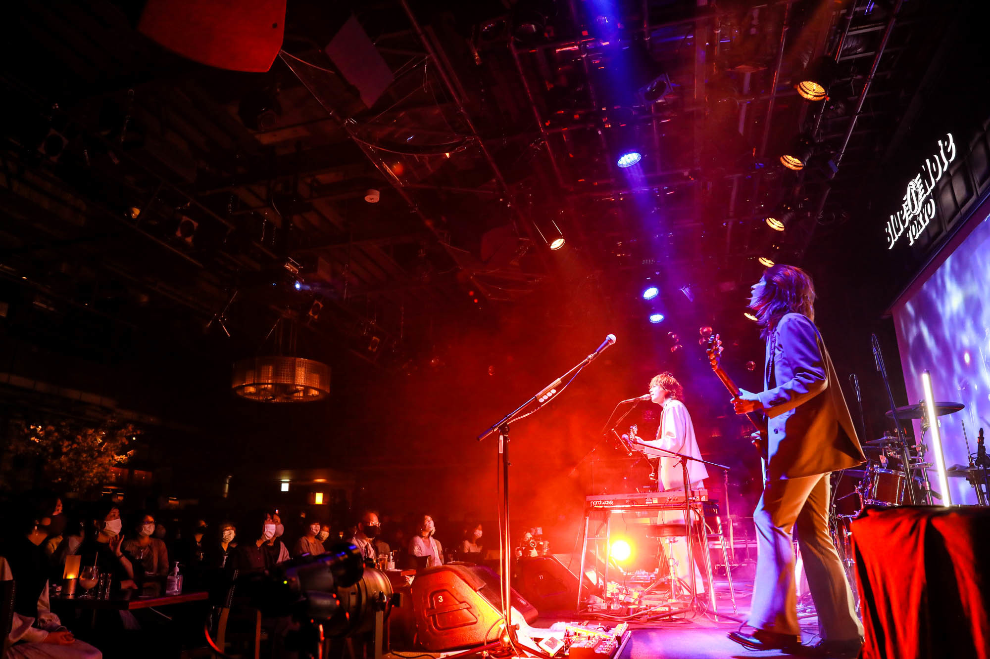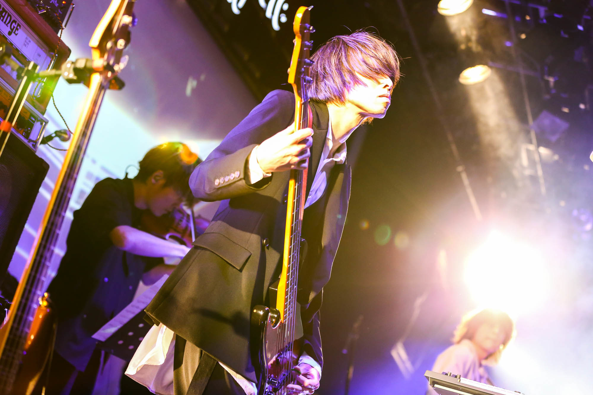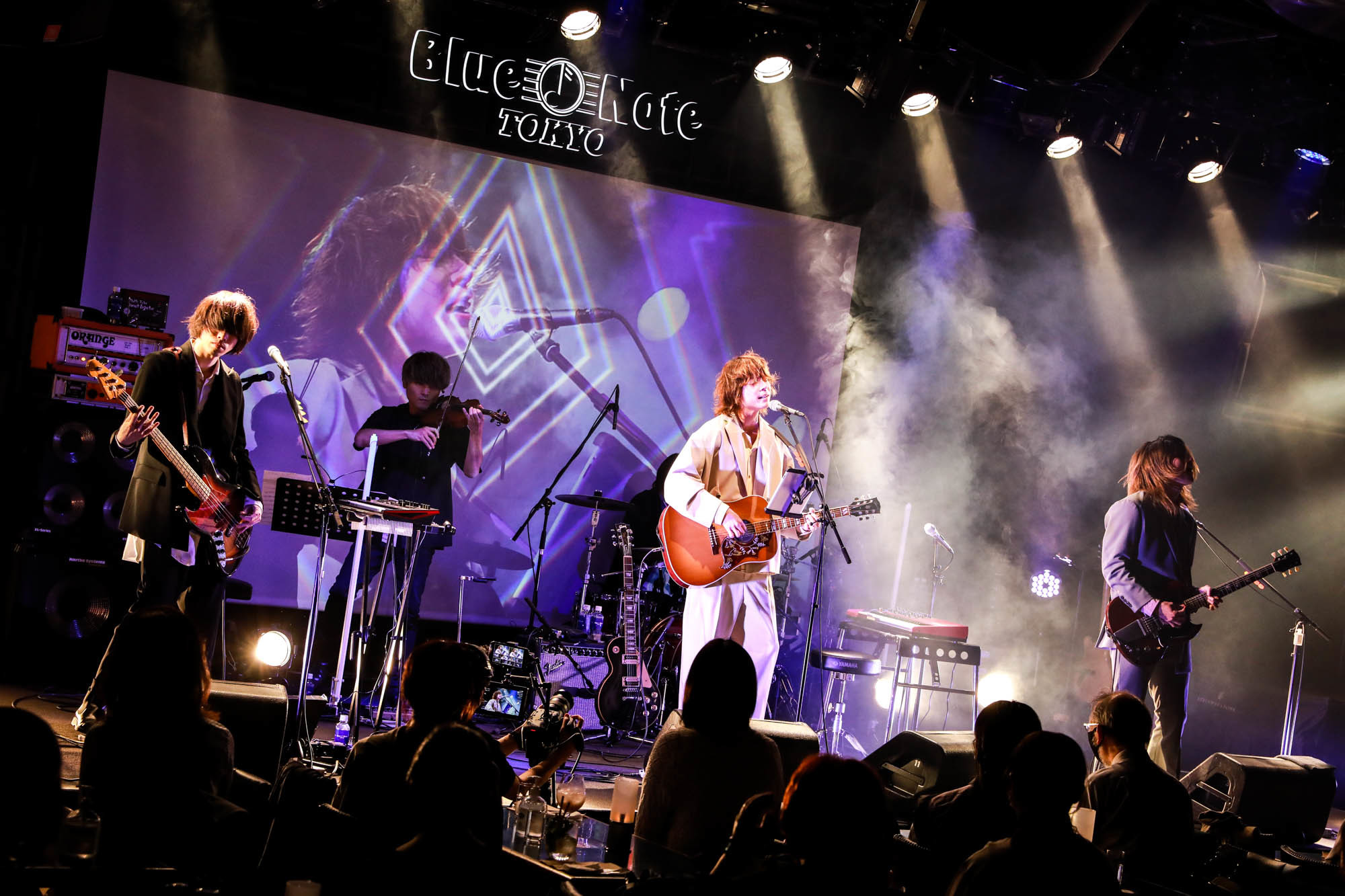 まず、各種イメージ映像やリアルタイムのステージの様子、その両方のミックスなど、様々な映像が背後のスクリーンに投射される演出に驚く。照明の派手さや光量に関してもこういった会場で行われるライブの範疇を超えていた。アコースティック寄りにアレンジすることはなく、音もデカい。ステージがあまり大きくない上に5人も立っているからギュウギュウだが、タナカヒロキ(Gt)を筆頭に魅せるアクション、プレイも忘れない。結果、終盤には曲中アドリヴで立ち位置を変更、タナカとヤマモトシンタロウ(Ba)がコミカルにコーラスマイクを奪い合ったりした挙句、シールドが絡まりまくるという微笑ましいシーンも生まれることになる。