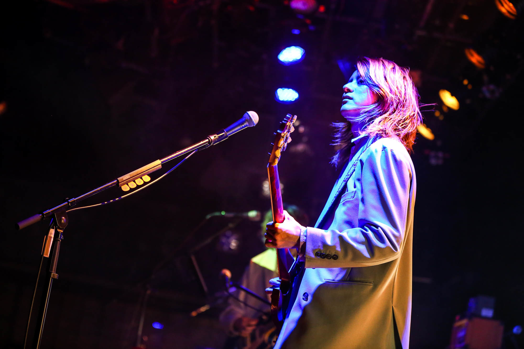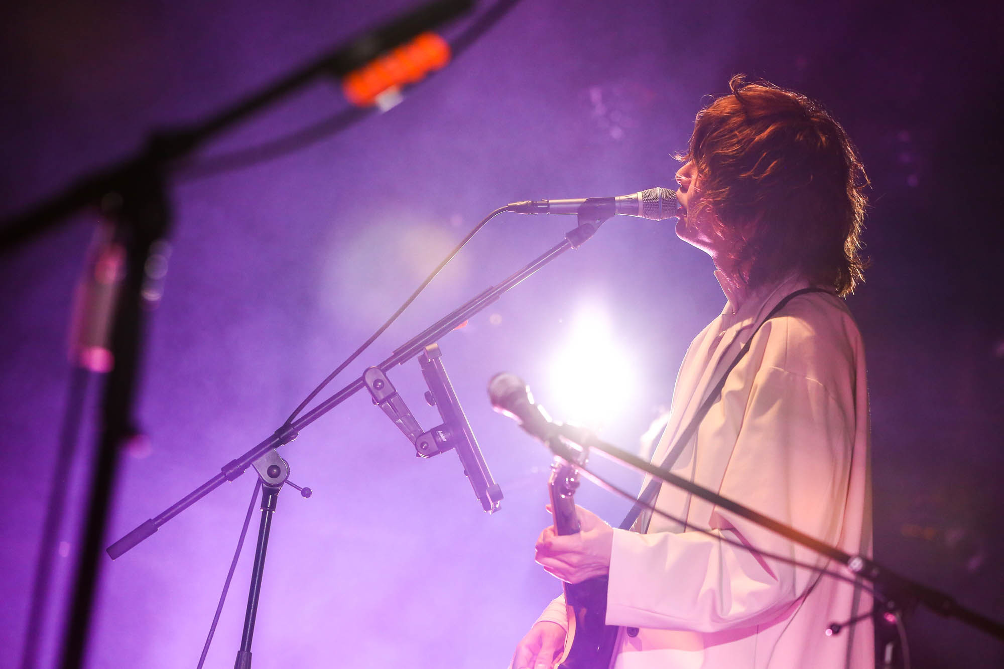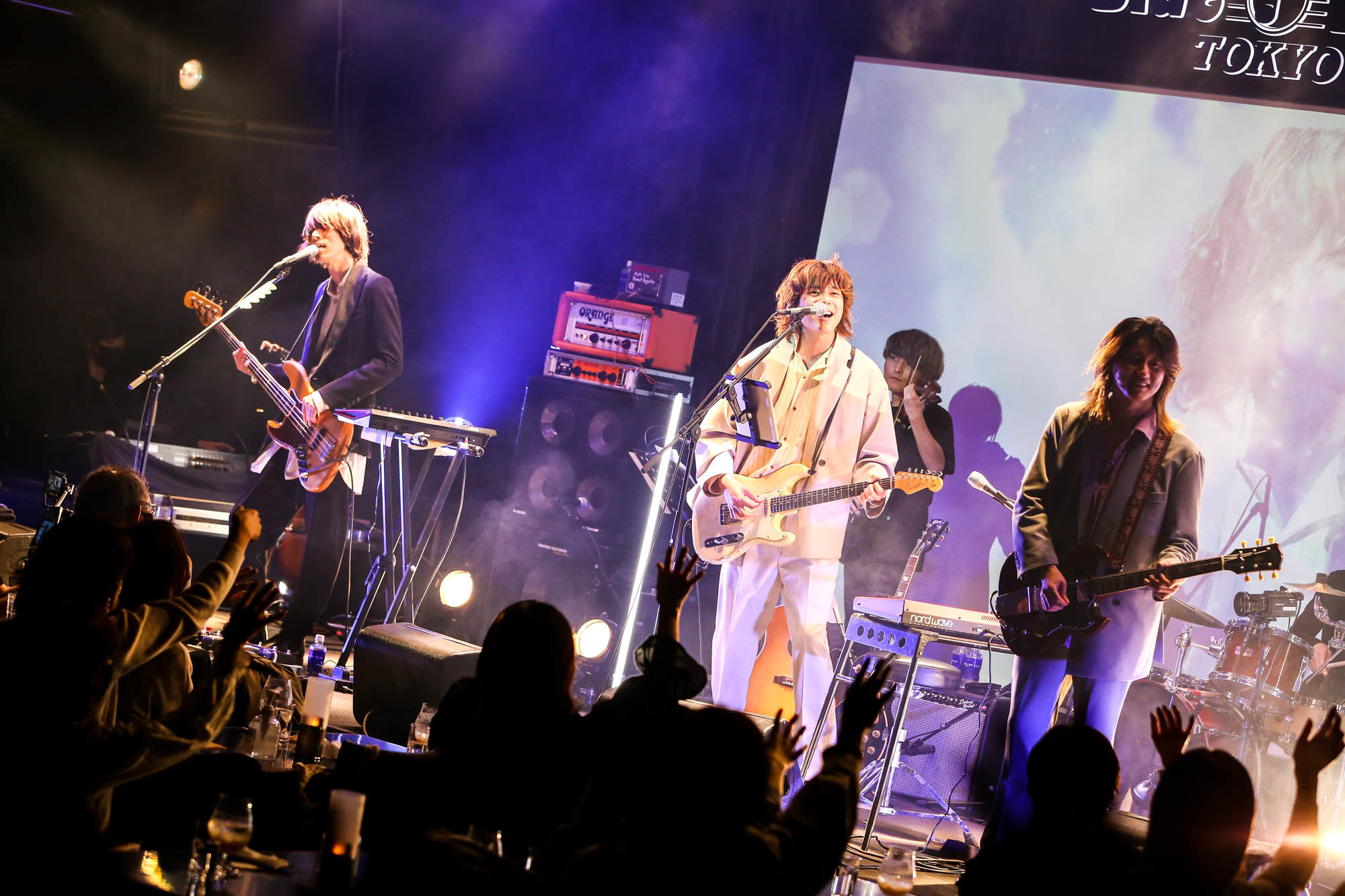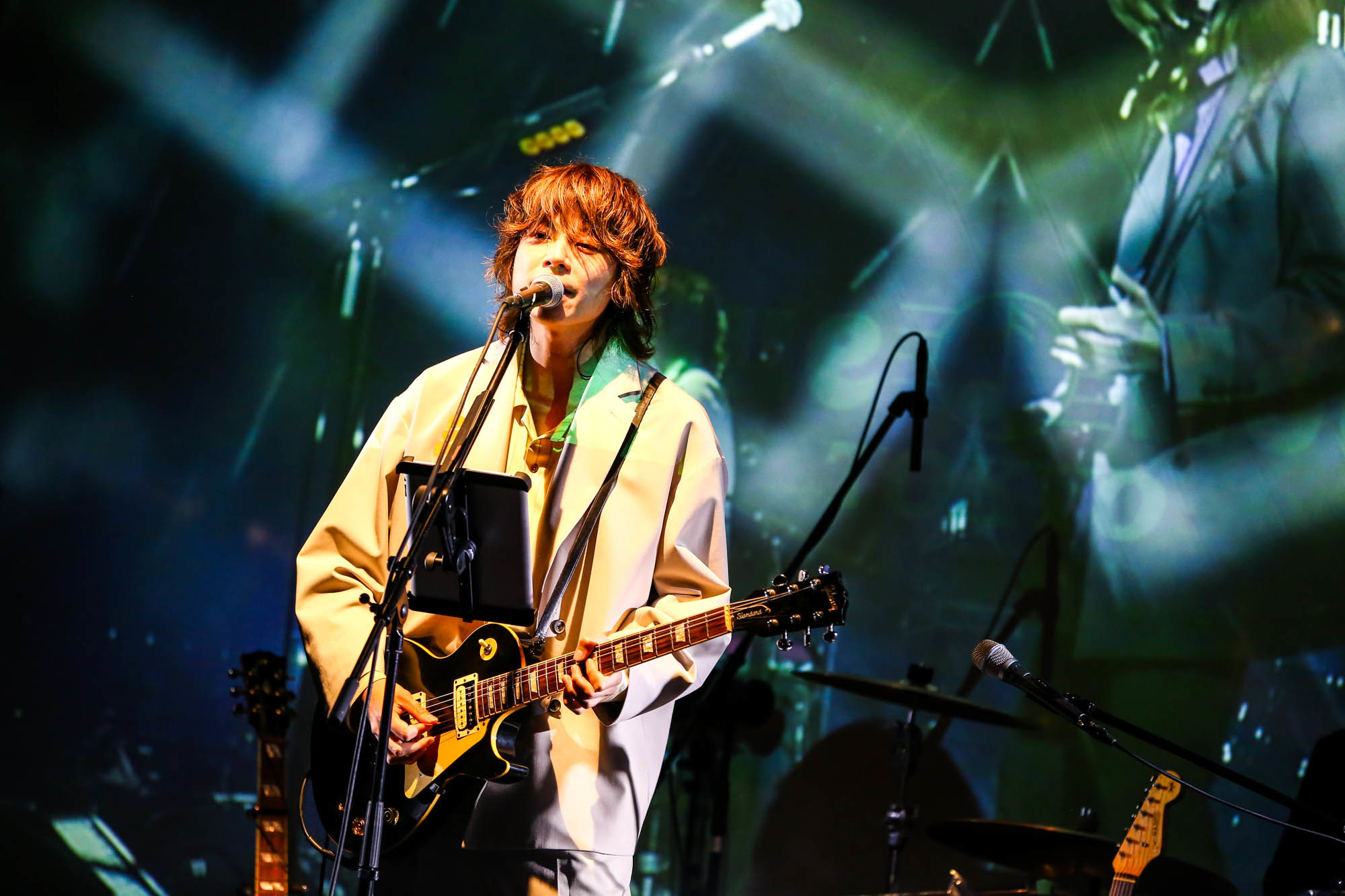 まず、各種イメージ映像やリアルタイムのステージの様子、その両方のミックスなど、様々な映像が背後のスクリーンに投射される演出に驚く。照明の派手さや光量に関してもこういった会場で行われるライブの範疇を超えていた。アコースティック寄りにアレンジすることはなく、音もデカい。ステージがあまり大きくない上に5人も立っているからギュウギュウだが、タナカヒロキ(Gt)を筆頭に魅せるアクション、プレイも忘れない。結果、終盤には曲中アドリヴで立ち位置を変更、タナカとヤマモトシンタロウ(Ba)がコミカルにコーラスマイクを奪い合ったりした挙句、シールドが絡まりまくるという微笑ましいシーンも生まれることになる。