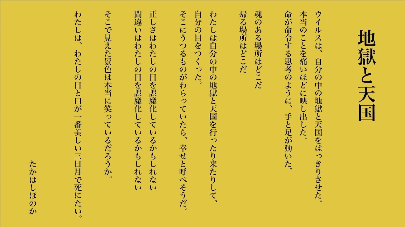 ウイルスは、自分の中の地獄と天国をはっきりさせた。本当のことを痛いほどに映し出した。命が命令する思考のように、手と足が動いた。