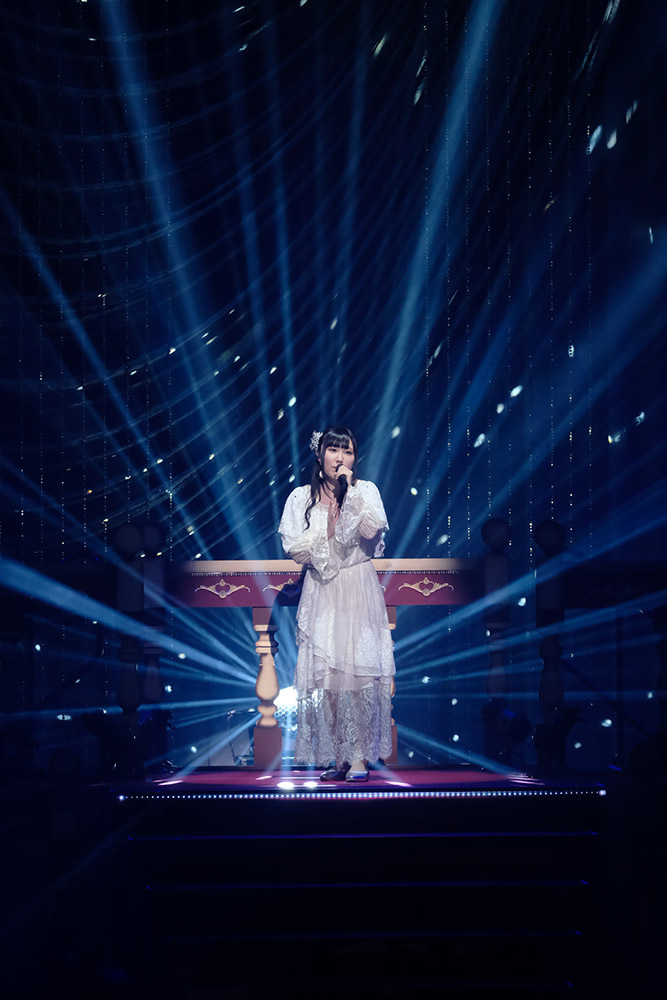 続くアコースティックコーナーでは純白の椅子に腰掛け「antique memory」、「繋がる縁 – ring -」を披露。 アコーディオンを中心としたアンサンブルには、相変わらずうっとりとしてしまう。また余談だが今回のライブではバックバンドの各メンバーにもしっかりとスポットが当てられていた部分も、このようなライブ演出を楽しむ一助になっていたことは付け加えておきたい。話によれば名古屋公演から今回のように、バンドメンバーにもマイクが付いて、コミュニケーションを楽しめる環境になったのだという。後日、彼女のTwitterの方でも改めて各メンバーの紹介がされていて、彼女自身のライブへの思い入れの深さを改めて感じたし、余韻に浸りたくなる気持ちが一緒なんだなと共感できた。