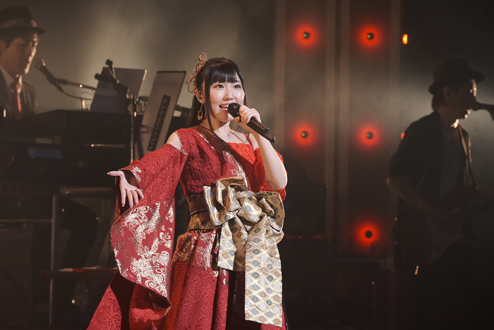 続くアニソンカヴァーパートは『第7回全日本アニソングランプリ』ファイナリストの肩書きを持つ彼女ならではセクションだ。横浜公演では『劇場版 名探偵コナンから紅の恋歌』主題歌の「渡月橋~君 想ふ~ 」、TVアニメ『デジモンアドベンチャー02』主題歌の「Butter-fly」の2曲を披露してくれたが、今回まず歌ったのはTVアニメ『地獄少女』の主題歌「逆さまの蝶」。この曲は彼女がかつてアニソングランプリの札幌予選に出るために歌ったという思い出深い一曲だ。またこの時、彼女が着ていた真紅の衣装も地獄少女の世界観にピッタリの演出となっていた。
