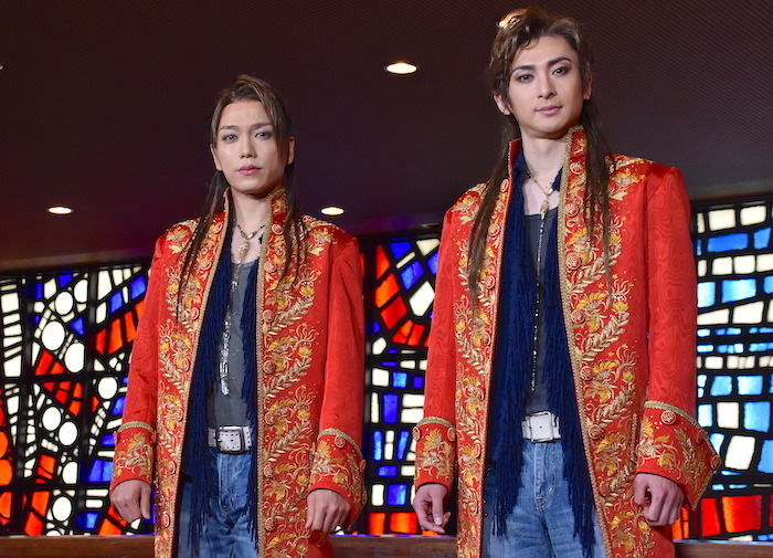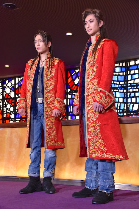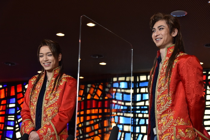 初日を前日に控えた4月7日(水)、ヴォルフガング・モーツァルト役の山崎育三郎と古川雄大(Wキャスト)が帝国劇場のロビーで報道陣の取材に応えた。
