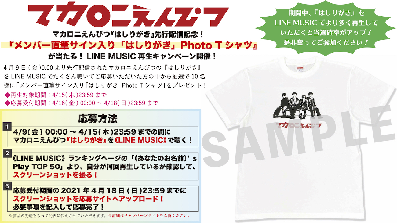 それに伴い、LINE MUSICにて独占キャンペーンの実施が決定した。キャンペーン応募者を対象に抽選で10名にメンバー直筆サイン入り激レアTシャツをプレゼントするというもの。LINE MUSICにて「はしりがき」を聴けば聴くほど当選率が上がる再生キャンペーンとなっている。詳細は特設サイトをチェックしよう。