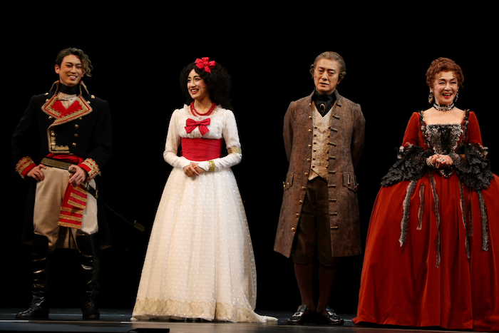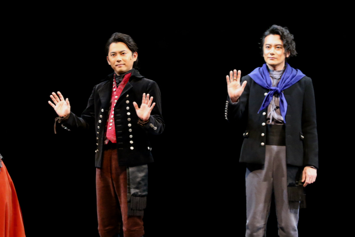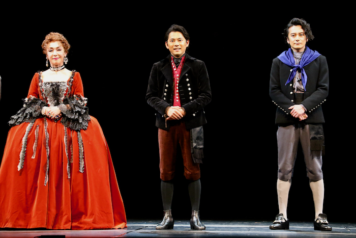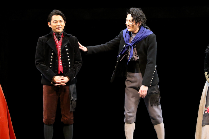 スペイン女王マリア・ルイサを演じるキムラは、自身の役を「スペインの王妃ですが、同じ王妃のマリーアントワネットをかわいくなくした感じ(笑)」と茶化したが、ラブシーンもあるそうだ。そのラブシーンに登場する若き宰相ゴドイを演じる塩田は「僕のポーズがいまいち決まらないときに、今井さんがパッと来て『こうすればいいんだよ』と教えてくださったことがありました」と、身振り手振りを交えて稽古中の出来事を振り返った。