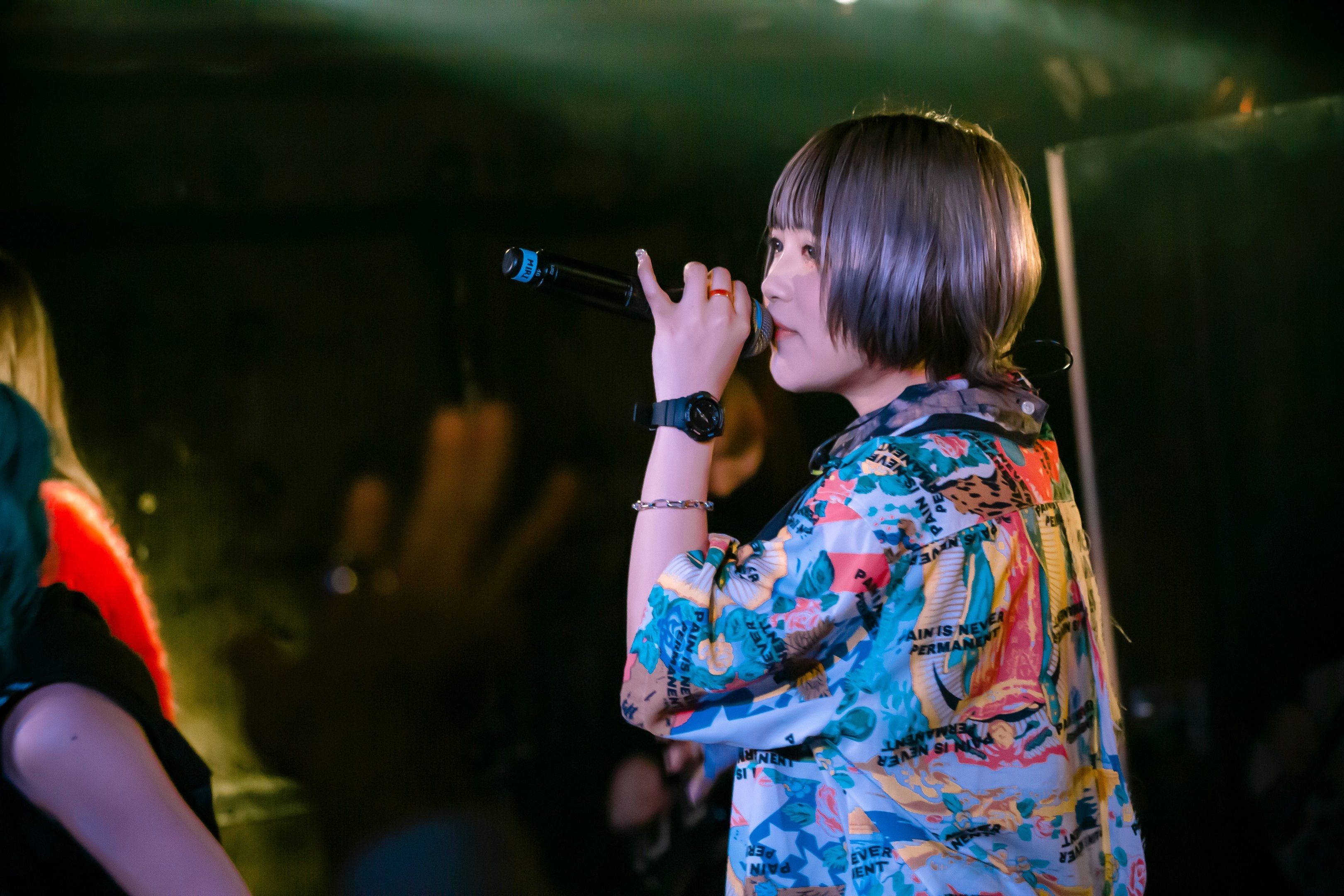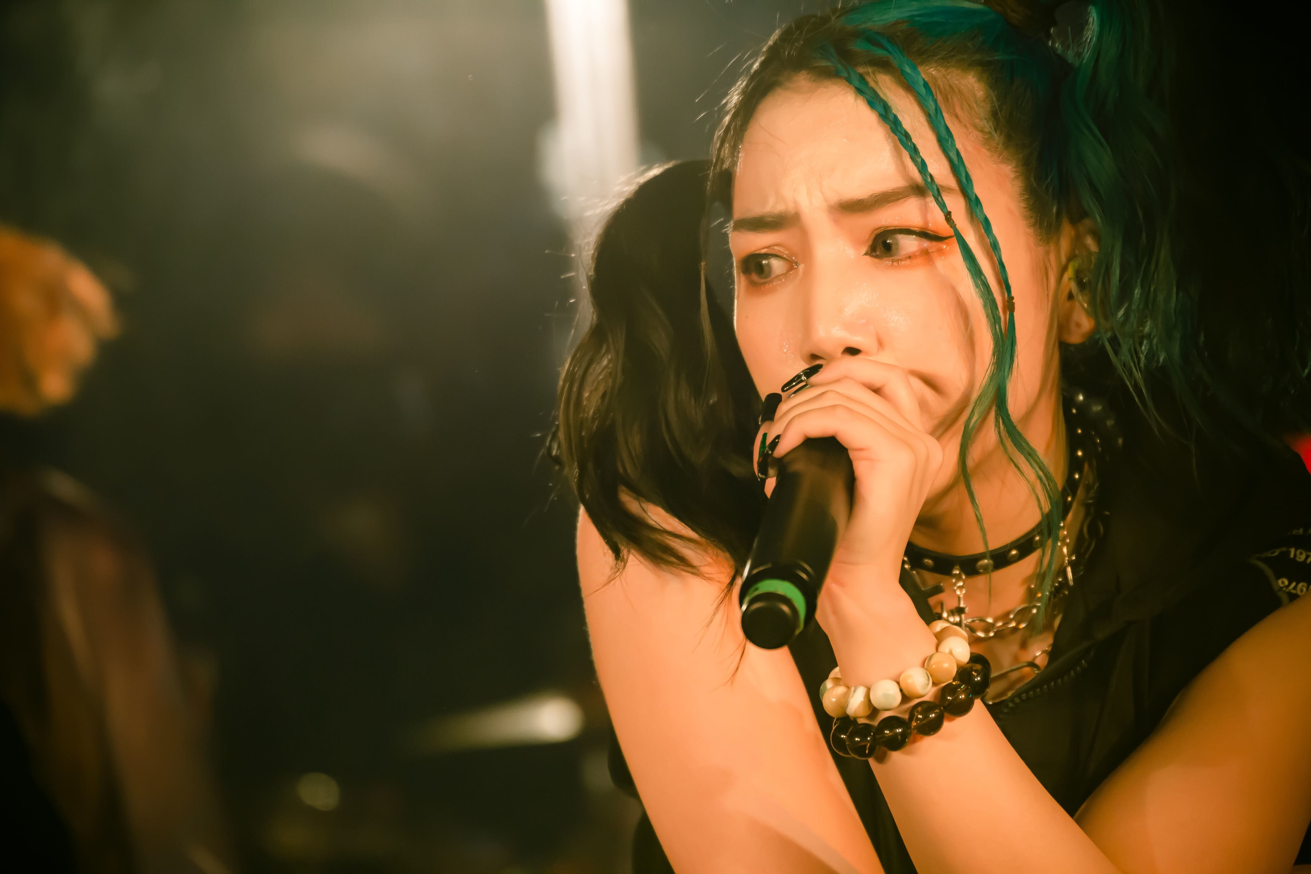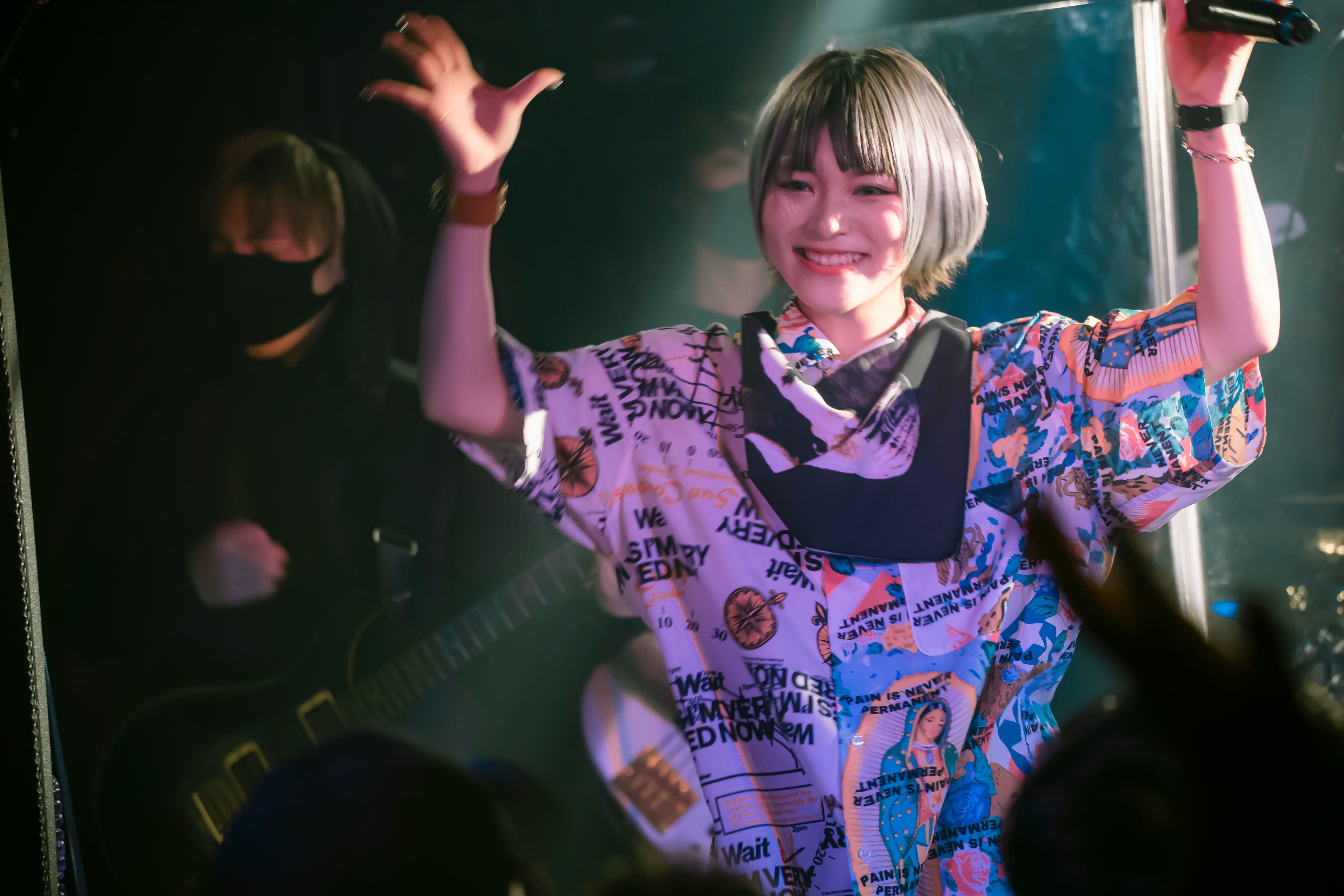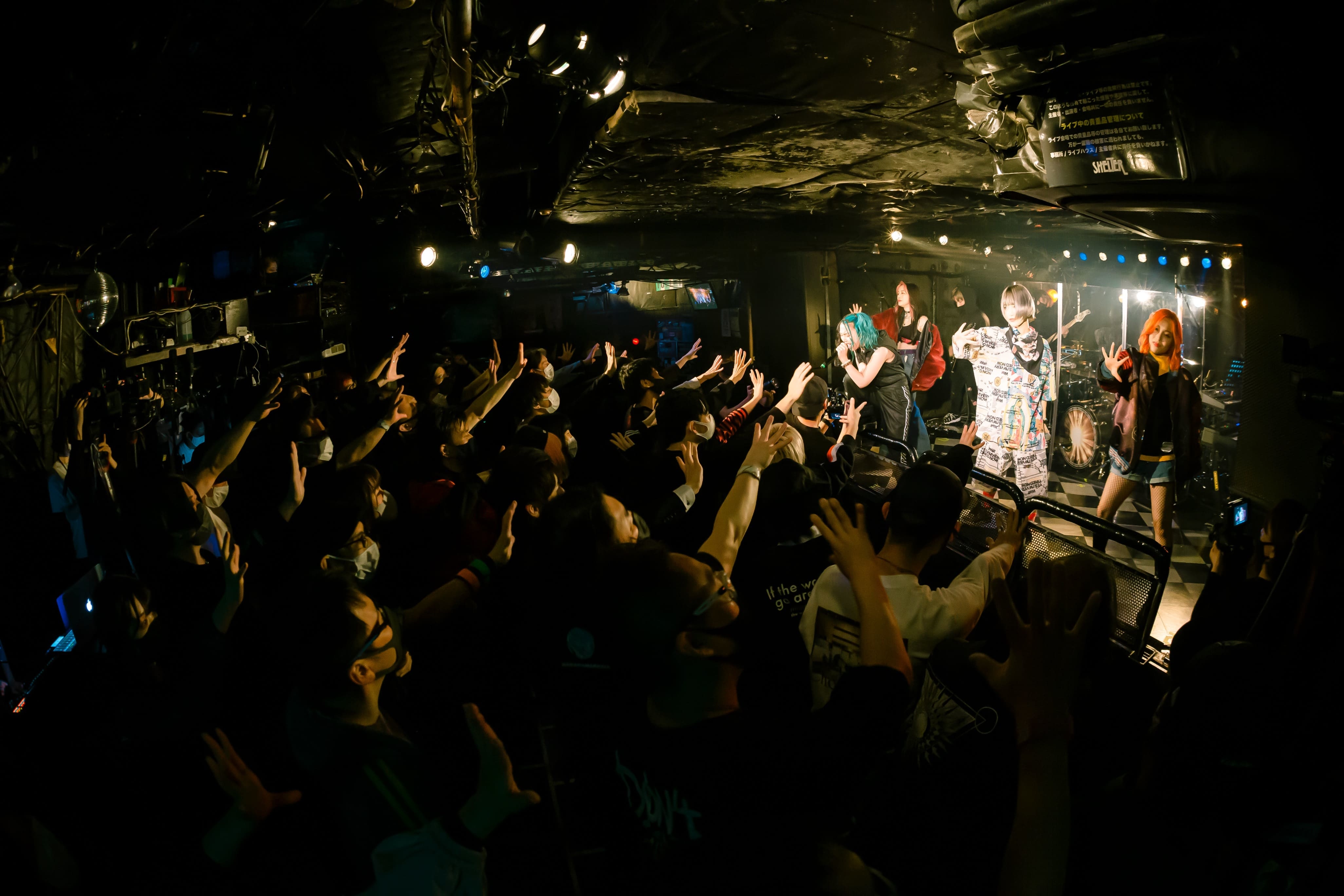 開演時間を少し過ぎた頃、照明が落ちてSEがけたたましく鳴り、メンバーが一人ずつステージに登場。「下北、お待たせしました! 楽しむ準備は出来てますか?」とMIRIが煽り、1曲目のイントロがバンド演奏の爆音で鳴らされると、声を出せない観客が歓声に代わりに拳を突き上げ、開演前から溜まっていた熱気が急上昇する。モッシュもリフトも出来ないけれど、瞬時に心通じ合い沸点に達するまでの異常なスピード感。いわゆる“新しいライブの形”を厳守しながら、それぞれが思い切り楽しめる空間作りがこんな容易に出来てしまうのも、闇に包まれても諦めずにライブをやり続けたラキアのひとつの成果だ。