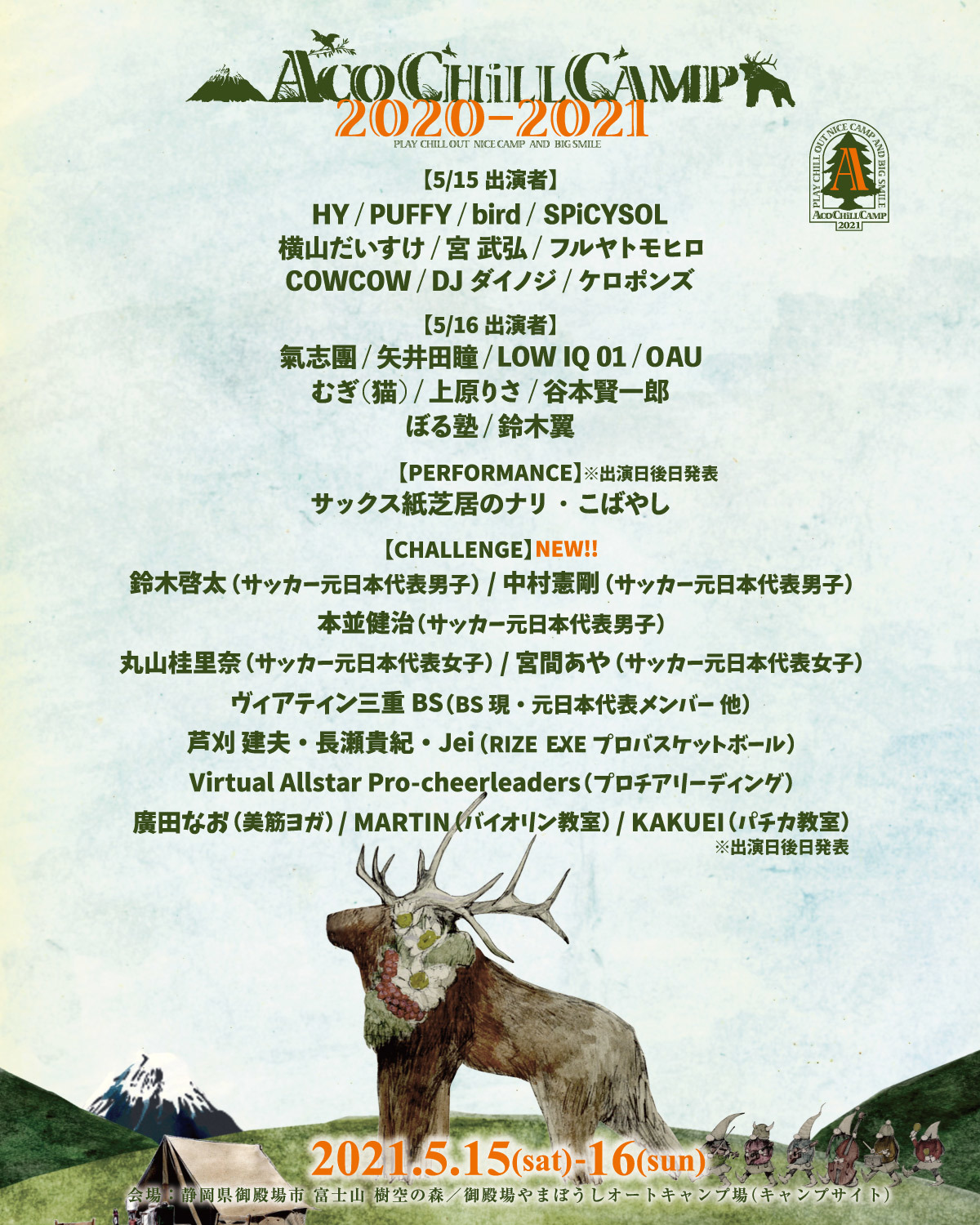 2021年5月15日(土)と5月16日(日)の2日間、静岡県御殿場市「富士山樹空の森」にて開催する『ACO CHiLL CAMP 2020-2021 〜アソブ、オドロク、フジサン、キャンプ。〜』の出演アーティストの日割りと参加型コンテンツに出演するアスリートらの発表が行われた。