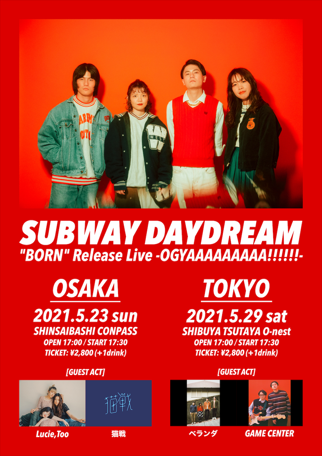 『”BORN" Release Live -OGYAAAAAAAAA!!!!!!-』は、4月28日に発売されるSubway DaydreamのEP『BORN』のレコ発。5月23日に心斎橋CONPASSで開催される大阪公演にLucie,Too、猫戦、5月29日に渋谷TSUTAYA O-nestで開催される東京公演にベランダ、GAME CENTERが出演する。ゲスト発表と同時にオフィシャル先行2次申込受付も開始されている。
