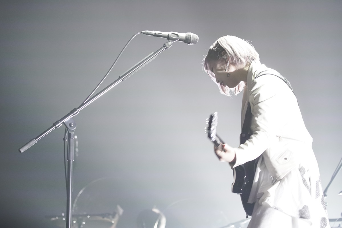 雨だれのようにピアノの音が響く中、バンドメンバーに続いて静かに登場したReoNa。エレキギターを構えて一曲めで奏でられたのは「untitled world」。小さな体にはステージに立てる喜びと音楽に対する渇望が詰まりきっている。それを解放するようにかき鳴らされるギター。