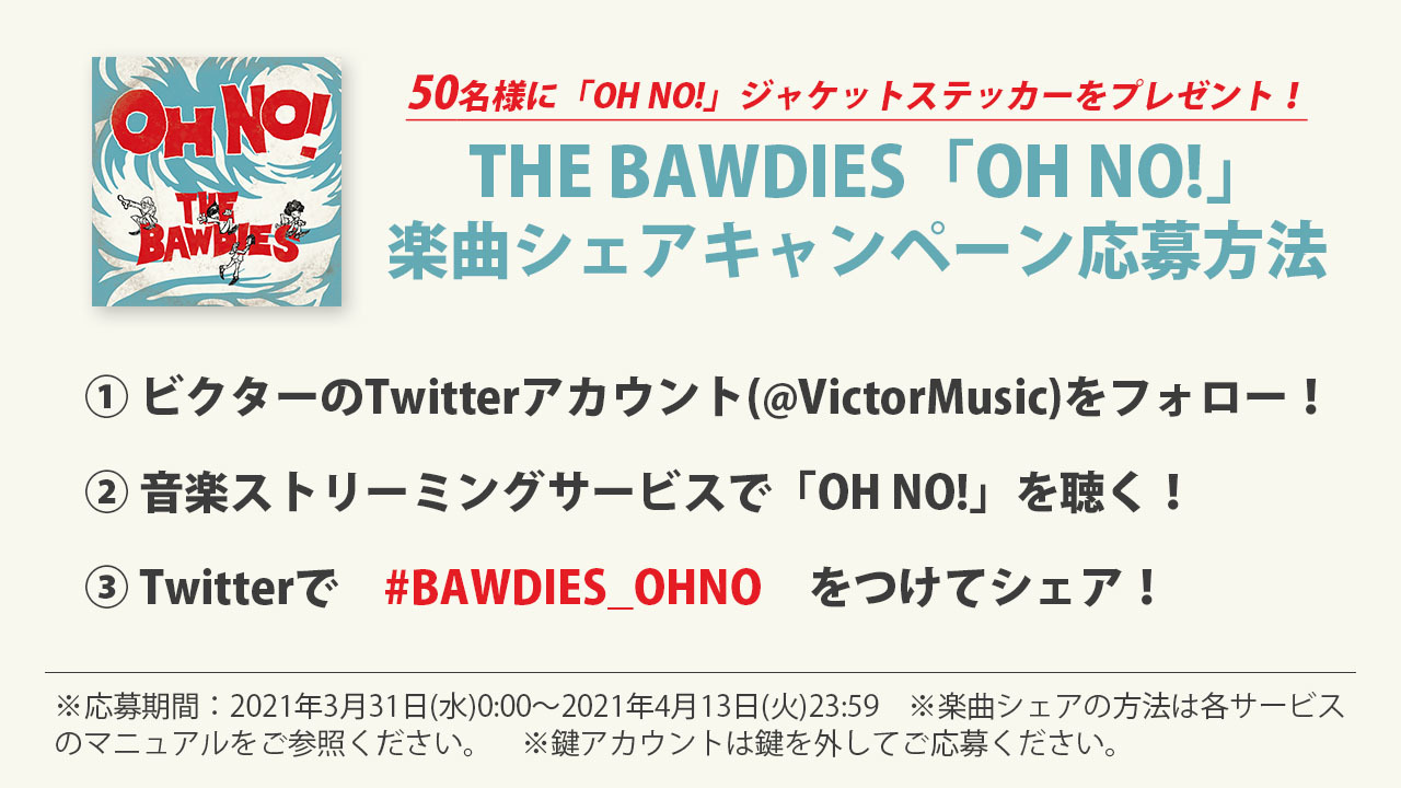 また現在、Twitterでは「OH NO!」楽曲シェアキャンペーンを実施中。「#BAWDIES_OHNO」をつけてApple Music、Spotify、LINE MUSICから「OH NO!」をTwitterへシェアすると、抽選で50名にメンバーデザインの「OH NO!」ジャケットステッカー(55mm × 55mm)がプレゼントされる。締め切りは明日4月13日(火)23時59分となっている。