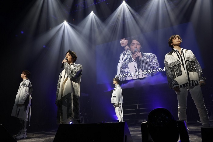 公演では、コロナ禍によって“当たり前ではなくなってしまった日常”を、四季をテーマとしたVTRとライブで表現していった。ハンサム学園を舞台にしたVTRコーナーでは、メンバーたちが個性豊かな生徒役を演じる中、富田が教育実習生のヒロイン・トミ子として登場。松岡演じる男性教師に「お前は松岡担だろ?」と壁ドンされるシーンなどが上映され、ファンの熱気を高めた。さらに毎年恒例となったVTR内の女装パートでは、藤原と新原がキュートな女子生徒姿を披露。スカート姿の新原が特技のダンスを踊る映像に、客席から拍手が起こった。