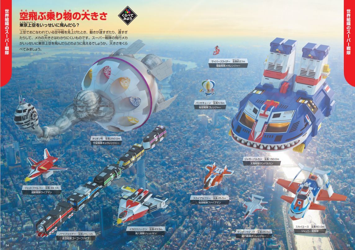 現実かのようにスーパー戦隊の乗り物が東京上空を飛行する様子を表した特集ページ