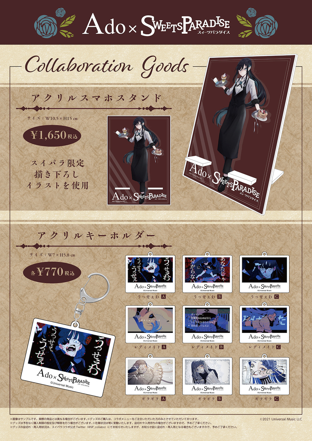 従来のスイーツパラダイス食べ放題のメニューにプラスで、”Ado”オリジナルコラボメニューの提供を実施。“Ado”のイメージディレクター・ORIHARA描き下ろしイラストや配信楽曲「うっせぇわ」・「レディメイド」・「ギラギラ」のジャケットイラストを使用したコラボメニュー、メニュー注文特典オリジナルコースター、オリジナルグッズなどが展開される。