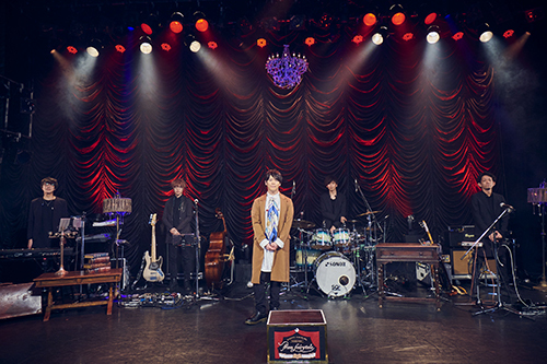 ソファから立ち上がり、歩きだした彼がバンドのいるステージを見つめれば、どうやらここが2階席であることがわかる。オペラの劇場のような会場の空気までも伝える演出だった。今度はバンドも移動。階段の上に作られたサブステージから、アコースティックセットでの「地図が無くても戻るから」。カホンとベースのビートにピアノ、そしてアコースティックギターと歌。シンプルだからこそ届く楽曲に宿る強い想い。セピア色の画面には地図も映し出され、楽曲の世界観をノスタルジックに彩りながら届けた。