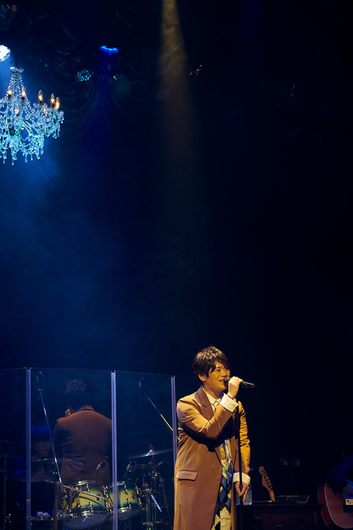 コンセプチュアルなアルバムの雰囲気のままライブは「miserable masuquarade –Re:andante-」へ。デビュー曲をアルバムの世界観で染め、色彩感豊かで艶のある古川の音楽を凝縮したようなバージョンで聴かせる一曲は、ピアノとホーンの音、そして楽曲の体温を刻むような印象的なベースラインとで紡がれる。そんな楽曲を古川は情感たっぷりに聴かせた。