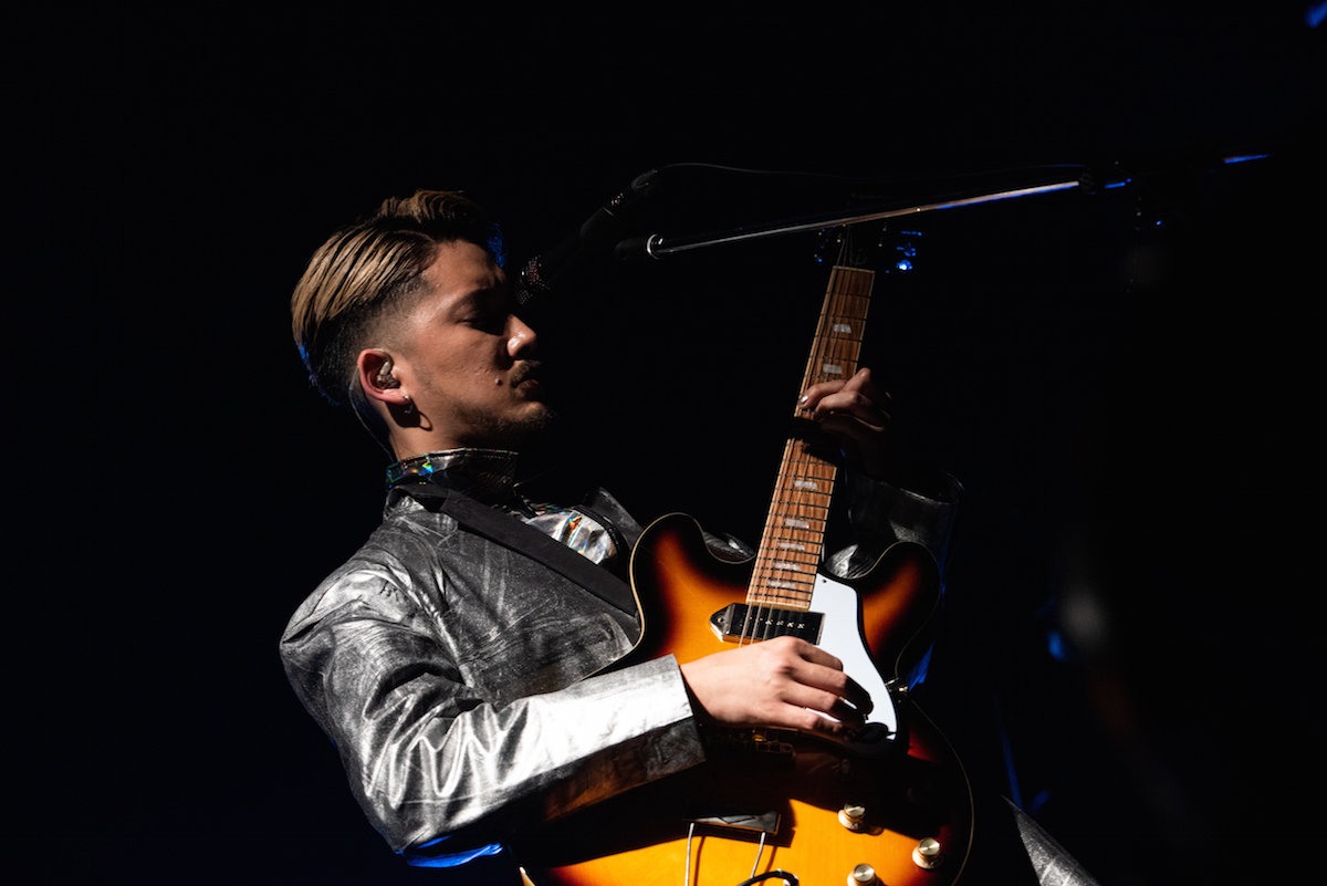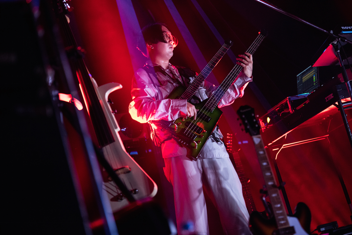 一瞬の暗転が別の惑星への移動をイメージさせ、江﨑のオルゴールのようにも聴こえるエレピの音から井上のエレクトリック・アップライトベースの深みのある低音が響く「Blue Moon」。一人ひとりのプレイが明快に聴こえることで、ライブへの没入感が高まり、「Signal」での江﨑の長めのピアノ・ソロが長編映画の劇伴のようなドラマ性を生む。そこに鳴る心音のようなSEは荒地に命を見つけたような効果をもたらし、続く長塚のボーカルに体温を感じさせくれた。井上のギターがフュージョン的でありつつビート感はハウスな「ESC」、場面転換的な「Third Kind」を挟み、再びブルーのライティングで場面転換。「Depth of Blue」のイントロが流れ込み、クラップが起こる。ファンがアルバムを聴き込んでいることが実感できる場面だ。奥の高いエリアでギターやベース、シンセベースなど持ち替えつつ、何も手にしていない時は踊る井上、そしてその井上を見て笑う江﨑と、ビビッドなメンバーの表情が捉えられているのも嬉しい。祝祭的なシンセサウンドから後半は明るいネオソウルのフレーバーに展開し、リリックの前向きな内容とリンクしていく。
