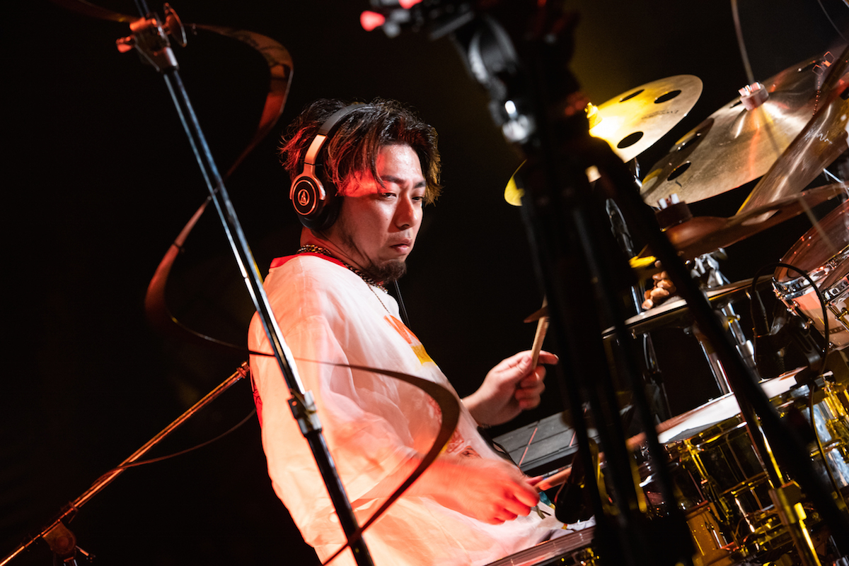 後半を特徴づけたのはハードかつインダストリアルな「If」。江﨑のブラッド・メルドー経由のグランジ体験がアレンジにも反映されているこの曲、ソリッドなロックをジャズアレンジのピアノに転換する手法は、ライブで一層ドラマチックだ。熱を帯びた演奏は「HEROISM」、「Fantasist」で加速。フロアに長塚が3・1・1拍のクラップを促し、他の演奏が止まった中、荒田が怒涛の関節外し的なソロを決め、大喝采が起きた。